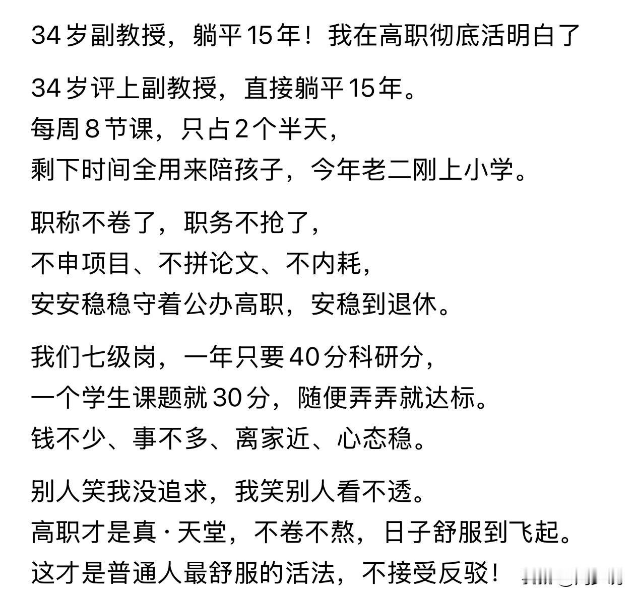 “34岁评上副教授,直接躺平15年!”近日,一位高职教师自曝生活状态,引发全网热议。他身处公办高职,34岁拿下副教授职称后,便放下了对更高职称、职务的执念。每周仅上8节课,占两个半天,其余时间全都用来陪伴家人,如今小儿子也顺利步入小学。学校科研要求不高,七级岗一年只需40分科研分,一个学生课题就能拿到30分,轻松就能达标。薪资稳定、工作清闲、离家又近,日子过得安稳又舒心。 面对旁人“没追求”的调侃,他反倒觉得,自己才是真正活明白了。此话一出,网友们也纷纷表示:“不是非要往上爬才叫成功,适合自己的就是最好的”。 还有网友更是坦言:“看懂了,普通人的幸福,本就不用靠内卷来定义”。 其实,这位老师的选择,周少反倒觉得何尝不是一种清醒的生活智慧。我们总被“必须上进”“一定要成功”的观念裹挟,在职场里拼命消耗自己,却忽略了生活本身的意义。 内卷从不是人生的唯一答案,学会取舍,找到适合自己的节奏,把时间留给家人和热爱,未必不是一种圆满。 不必强迫自己活成别人眼中的优秀模样,在安稳的岗位上做好本职,守住内心的平和,把小日子过踏实,对普通人来说,就是最难得的幸福。 对于这位副教授的选择,大家怎么看呢?#寻美三湘# #周少说教育#
