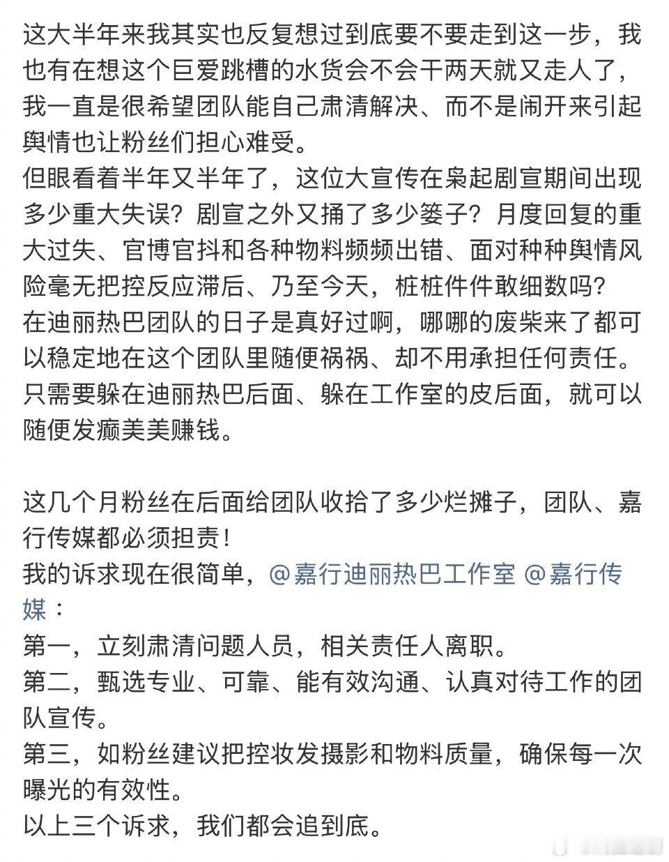 迪丽热巴新剧开播在即,前对接发长文督促嘉行迪丽热巴工作室行动起来,尽快调整,团结一致。