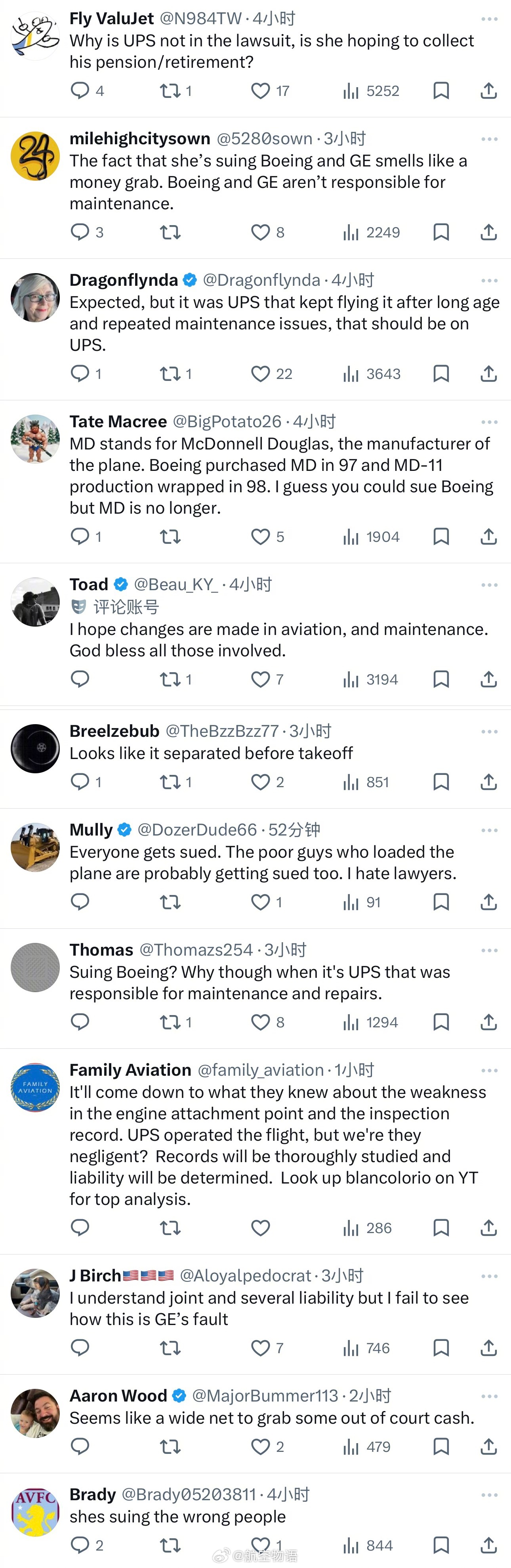 【丈夫驾驶飞机遇难 家属起诉多方要赔偿】去年11月初在路易斯维尔起飞时发生空难的UPS 5X2976航班上遇难机长Dana Diamond的妻子于2月25日起诉了飞机制造商波音、发动机制造商GE航空和维修服务商 VT San Antonio Aerospace。