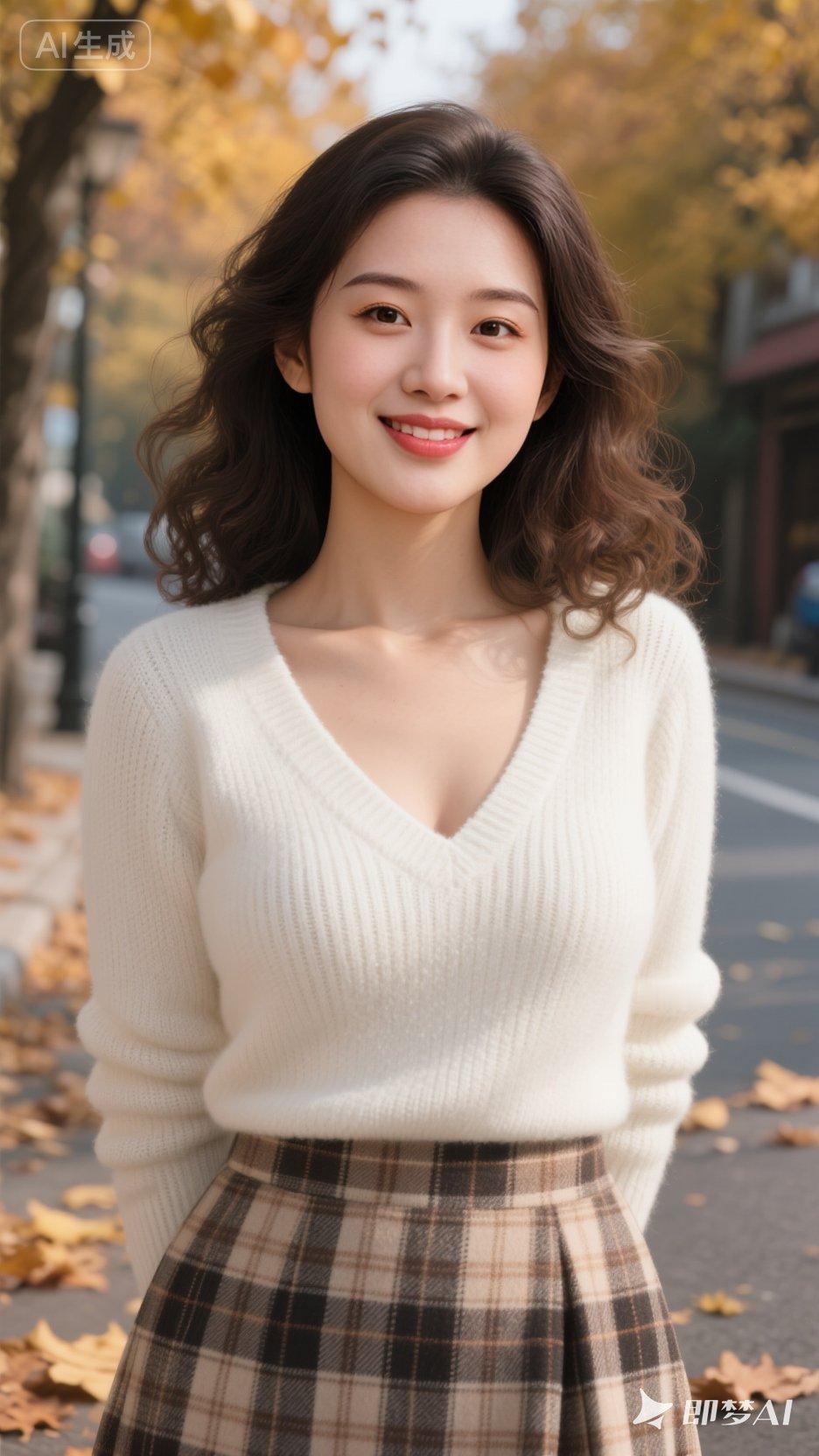 中国绝色美女,苹果型可爱身材,上半身圆润有生活气息,穿白色毛衣搭配格子深V领裙子