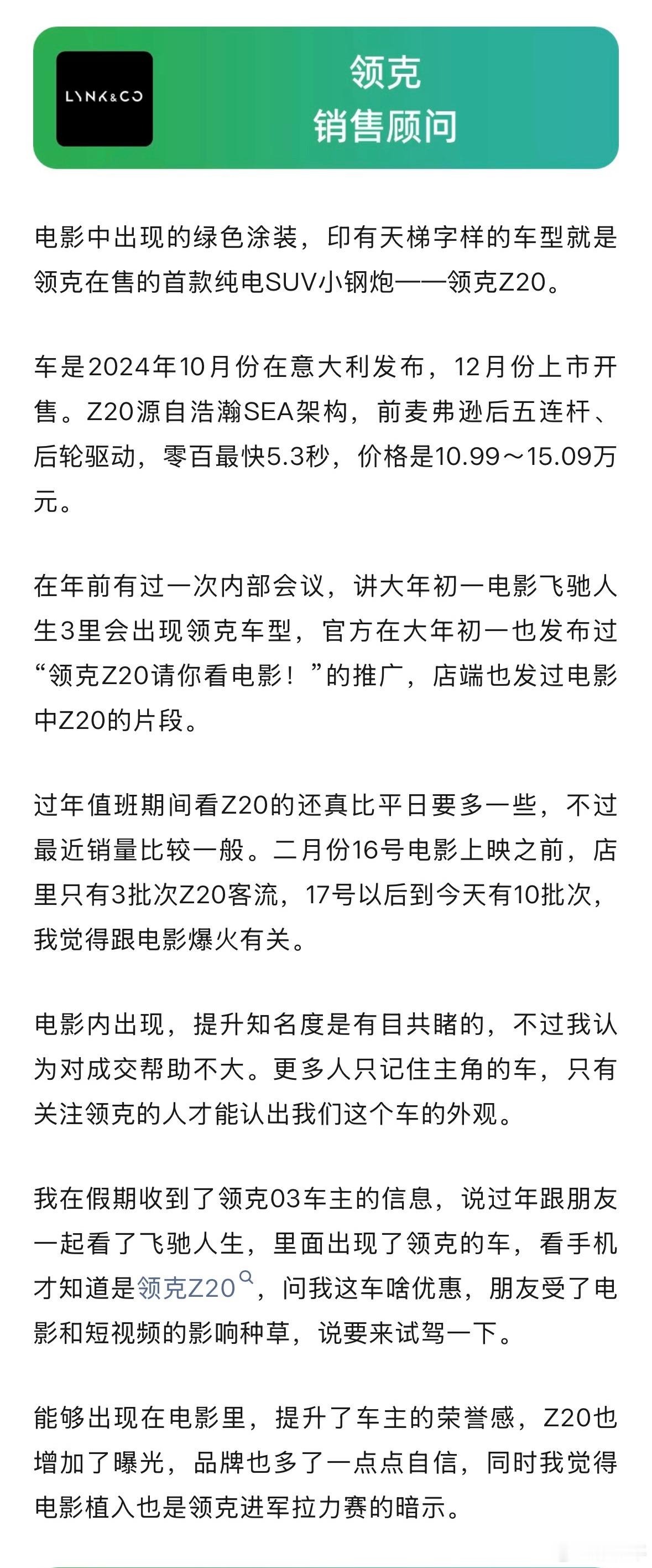 领克:电影内出现,提升知名度是有目共睹的,不过我认为对成交帮助不大。更多人只记住主角的车,只有关注领克的人才能认出我们这个车的外观。