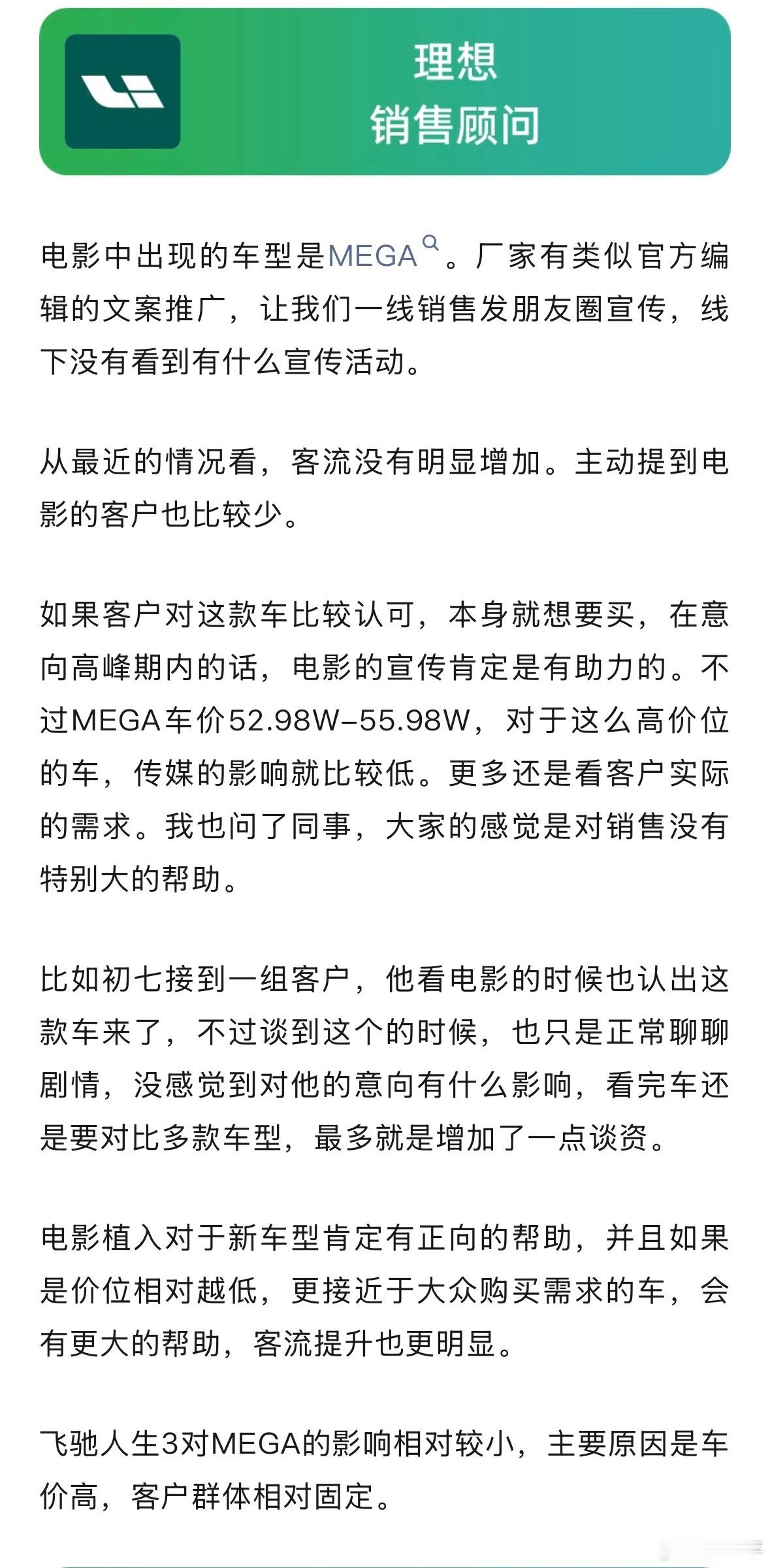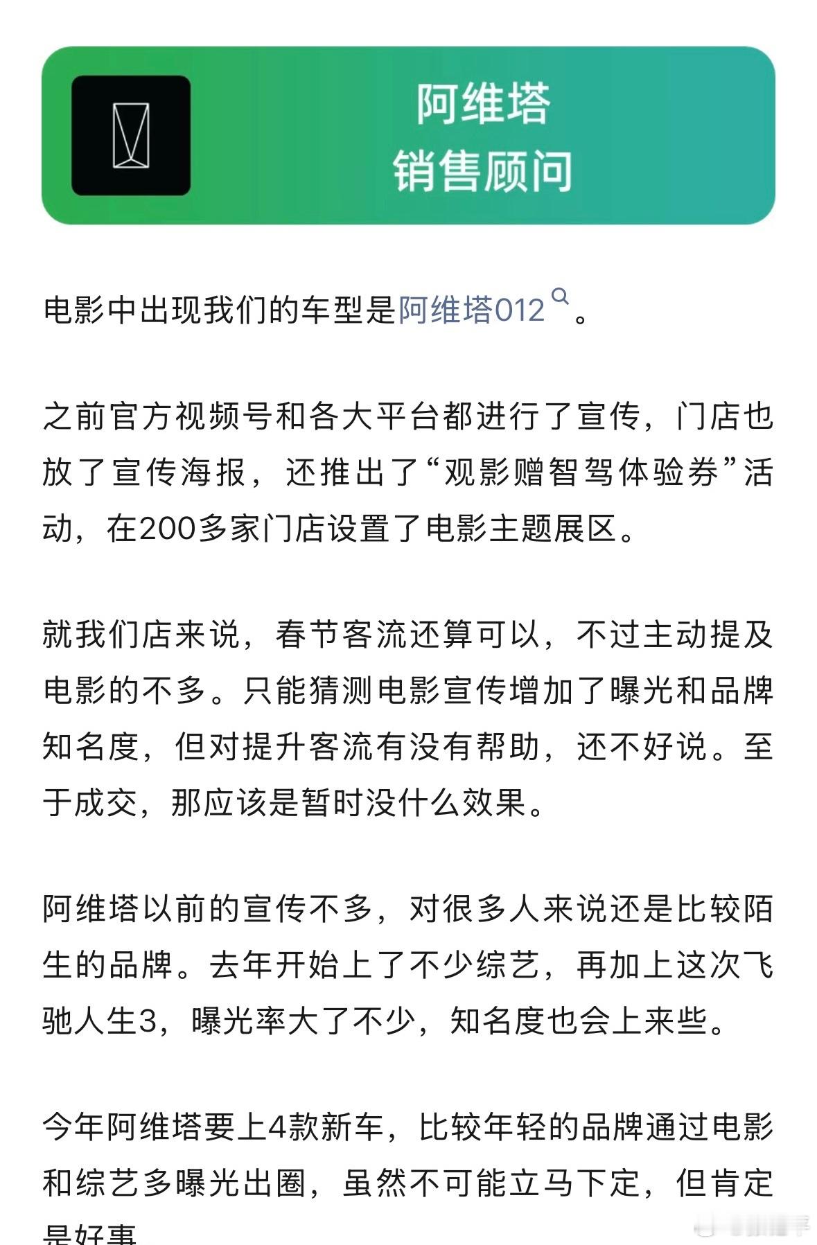 阿维塔12:只能猜测电影宣传增加了曝光和品牌知名度,但对提升客流有没有帮助,还不好说。至于成交,那应该是暂时没什么效果。