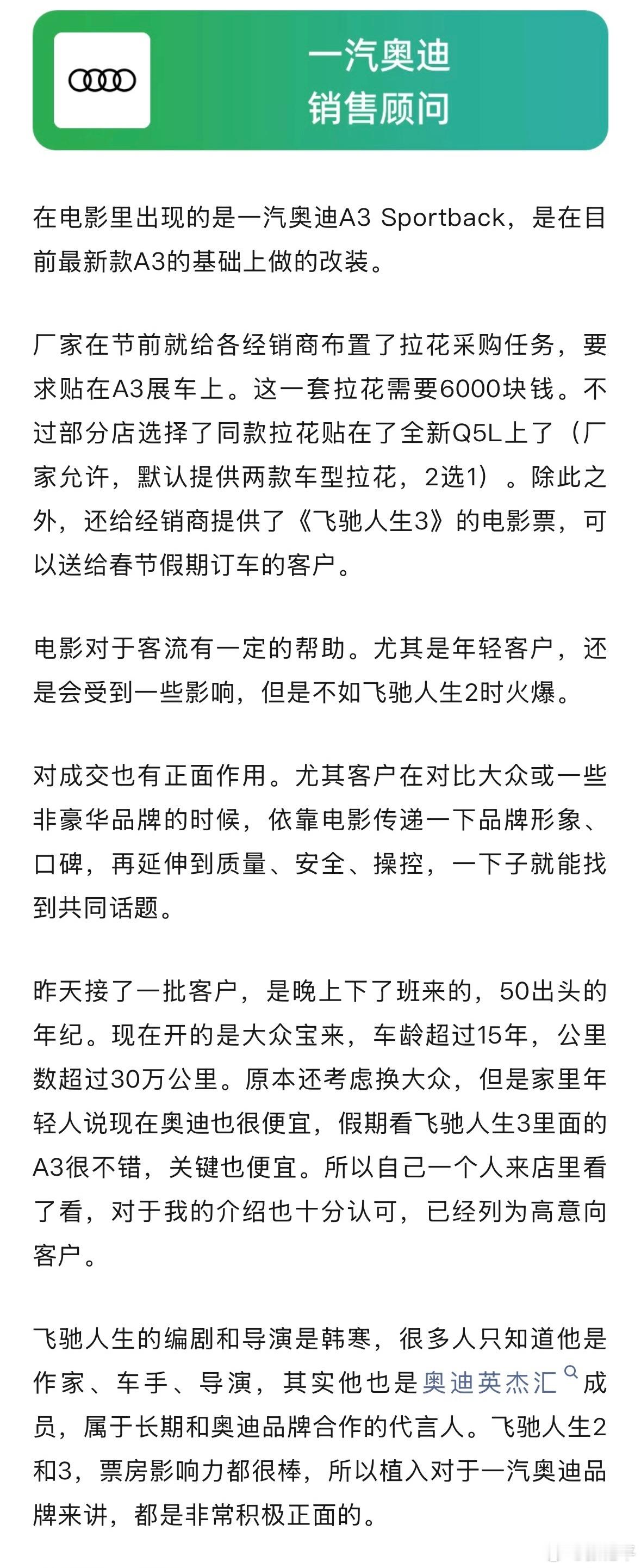 一汽奥迪:电影对于客流有一定的帮助。尤其是年轻客户,还是会受到一些影响,但是不如飞驰人生2时火爆。
