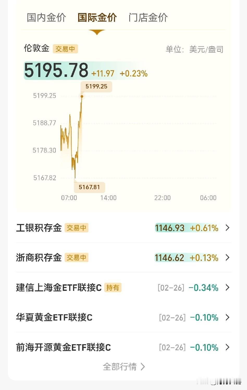 康康! 老妇预测的没错吧! 我就说今天黄金价格会涨,开盘就拉上去了,今天5200美元没问题。 弄点体验金扔进去,每天观察,就会对涨跌有预感,它不会直线一直涨,也不会直线一直跌下去,就跟K线一样忽闪忽闪前进,走两步退一步。 恭喜树上的朋友,今天可以下来一批,我在树上待习惯了,不想下来,最多扔一半,得留一半玩。