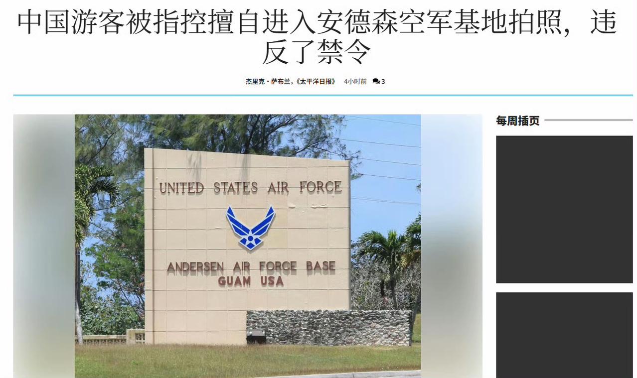 一名叫做Bingkun Feng(男)的中国游客因为拍摄关岛的美军基地而被捕,2 月 19 日上午 11 点 20 分左右,冯某驾车前往关岛安德森空军基地正门主入口检查站,冯某询问一名二等人士兵是否可以给她拍照,遭到拒绝。负责守卫的美军看到冯某一边开车一边举着手机,其行为像是在拍摄照片或视频。 美军发现他的手机屏幕清晰可见,他正在使用一款中国导航软件应用程序进行导航,并将“HSC-25”设为他的目的地。HSC-25 是MD一等人部署在安德森空军基地的第 25 直升机海上作战中队。导航定位点位于安德森机场靠近飞行跑道的地方。 在入口检查站点前约 50 米处,道路上画着一条蓝线,上面用白字写着“美国政府财产”,将基地边界与公共土地分隔开来。大门外张贴着告示,表明只有授权人员才能进入基地,并且该告示还有包括普通话在内的其他语言译文。文件显示,现场还有一个标志表明禁止拍摄该装置,标志上画着一个被红色圆圈圈起来并有一条斜线穿过的相机,以视觉方式表明禁止拍照。空军特别调查办公室扣押了冯的手机,一部蓝色 iPhone 14。 特工人员随后赶到现场,冯某同意他们搜索其手机的照片库,并在照片中发现了两张以安德森空军基地为背景的军人照片。 起诉书称,他们还发现了位于主入口外的安德森空军基地标志的照片,以及两张以主入口检查站为背景的进城车道照片。 对冯某的询问显示,他于2月18日携子乘坐大韩航空抵达关岛。文件显示,冯某在哈蒙一家酒店预订了三晚住宿,在杜梦一家酒店预订了一晚住宿,并租了一辆灰色起亚K4汽车,原计划于2月22日乘坐大韩航空离开。 起诉书称,冯某表示,他从一家中国新闻网站和一款名为“小红书”的中国社交媒体应用上了解到了关岛和安德森空军基地。根据起诉书,冯某解释说,中国新闻经常报道安德森空军基地以及美国F-22战斗机的性能。 文件显示,冯某称他在几个关于关岛行程的帖子中看到了基地外部标志的照片。他使用一款中国导航应用程序,意图前往HSC-25基地。起诉书称,冯某表示,中国公民不允许进入中国军事设施,如果试图进入,很可能会被逮捕。文件还显示,冯某称,拍摄中国军人、地点或装备是被禁止的,一旦被发现可能会被逮捕。 起诉书称,冯某自称是中国廊坊市的一名刑事和民事律师,离婚后独自抚养儿子。