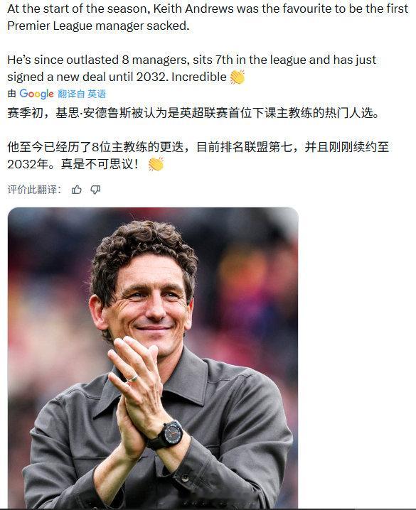 英媒点评:赛季初,安德鲁斯被认为是英超联赛首位下课主教练的热门人选。之后,他至今已经历了8位主教练的更替,目前布伦特福德排名联赛第7位,并且他刚刚续约至2032年。真是不可思议!