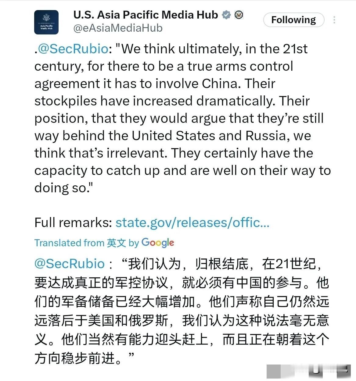 不认同中国的立场!美国国务卿鲁比奥再次点了中国的名!2月26日,美国国务卿鲁比奥表示, 我们认为,在21世纪,任何真正意义上的军控协议,都必须把中国纳入其中。中国的核武库规模已大幅扩张。 中方所持的立场——即认为自身核力量仍远落后于美俄——我们认为这一点毫无意义。中国显然具备迎头赶上的能力,而且正朝着这个方向稳步前进。 美国国务卿鲁比奥最近这番点名中国的表态,说白了就是拿着军控的幌子给中国挖坑,但凡有点常识的人,都能看明白这话里藏着的霸权心思,鲁比奥嘴里所谓的“21世纪军控协议必须纳入中国”,根本不是真心想推动全球核裁军,本质上是想给中国的核力量发展套上紧箍咒,用所谓的国际规则锁死中国自保的能力。 他故意回避了一个最核心的事实,那就是当前全球核武库的大头全攥在美国和俄罗斯手里,两国核弹头加起来占了全球总量的90%以上,不管是现役部署数量,还是可随时投入使用的核弹头规模,都比中国高出不止一个量级,中国的核力量规模,连他们的零头都够不上。 事实上,全球核军控的逻辑从来都是清晰的,谁拥有最多的核武器,谁就该承担最主要的裁军责任。这就好比两个手里攥着上千把枪的人,放着自己的武器库不管,反倒盯着旁边只揣了几十把防身的人,嚷嚷着要一起限枪,这本身就是彻头彻尾的双标和强盗逻辑。 之前美俄之间的军控协议,之所以只在两国之间谈,就是因为只有他们俩处在全球核力量的第一梯队,只有他们先带头大幅削减核武库,才有资格拉着其他国家谈全球军控。 可现在美国放着自己家里堆积如山的核弹头不管,反倒揪着中国不放,说白了就是不想放弃自己的核霸权,还想逼着中国自废武功。 很显然,鲁比奥说的“中国核力量落后美俄毫无意义”,完全是在偷换概念、颠倒黑白。中国从来没有想过跟美俄搞核军备竞赛,中国的核政策从始至终都是明确的,那就是不首先使用核武器,不对无核国家使用或威胁使用核武器,所有核力量都只维持在国家安全需要的最低水平,从来没有在海外部署过一枚核武器,更没有拿着核武器到处吓唬人。 可美国呢?不仅从来没有承诺过不首先使用核武器,还在不断研发低当量核弹,把核武器往实战化方向推,甚至拉着盟友搞核共享,在亚太地区不断部署战略轰炸机、核潜艇,把核威慑直接摆到了中国家门口。 事实上,美国自己就是全球核军控体系最大的破坏者,之前接连退出中导条约、开放天空条约,就连美俄之间仅剩的新削减战略武器条约,也迟迟不愿意拿出续约诚意,自己都不想遵守军控规则,反倒反过来要求中国加入,这本身就十分可笑。 中国之所以会适度提升核力量,完全是被美国的围堵和威慑逼出来的,美国一边在中国周边拉帮结派搞军事同盟,不断挑起地区紧张局势,一边又想让中国停下发展自保能力的脚步,天底下哪有这样的道理? 由此可见,中国的立场没有任何问题,也绝对不可能接受这种带着霸权滤镜的无理要求。鲁比奥嘴里的军控,从来都不是平等的谈判,而是想让中国接受一套完全不公平的规则,逼着中国把核力量锁死在远低于美俄的水平,好让美国能永远拿着核霸权拿捏中国。 美国要是真的想推动全球核军控,就先拿出诚意,把自己的核武库削减到和中国同一水平,再来谈所谓的纳入协议,不然说再多漂亮话,都掩盖不了想维持核霸权、打压中国发展的真实目的。