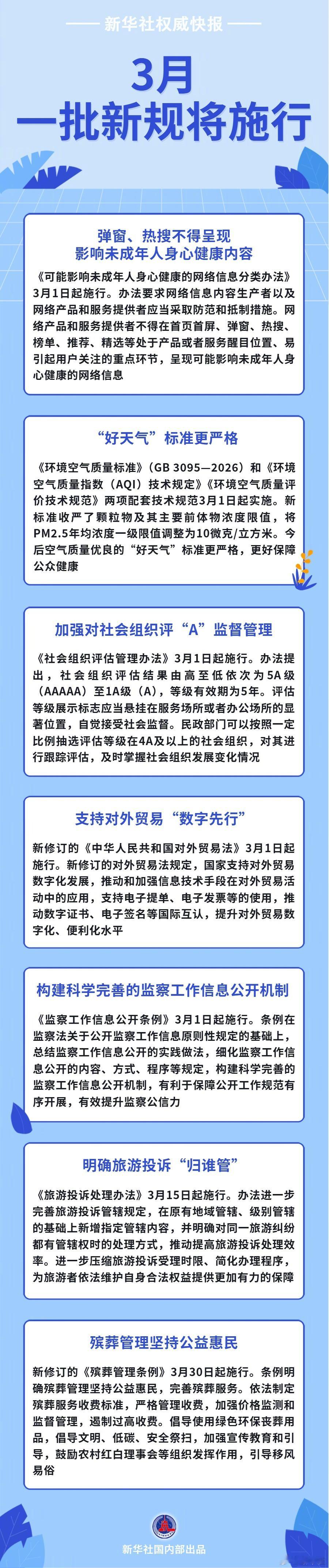【3月起将实施的新规】首页首屏、弹窗热搜等不得呈现影响未成年人身心健康的网络信息;“好天气”标准更严格,更好保障公众健康;加强对社会组织评“A”监督管理……3月,一批新规将施行,一起来看! (新华社)