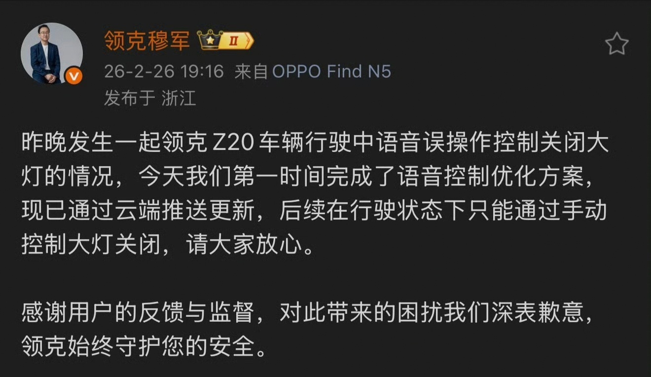 我一直都觉得车辆应该保留必要的物理按键,车企不能为了中控台简洁好看就把所有的功能都塞到屏幕里。总会有意外的时候,比如屏幕死机等。之前禁用隐藏式门把手我觉得就挺好的,有安全隐患的东西,我们就应该禁用。多位领克车主测试语音关闭大灯
