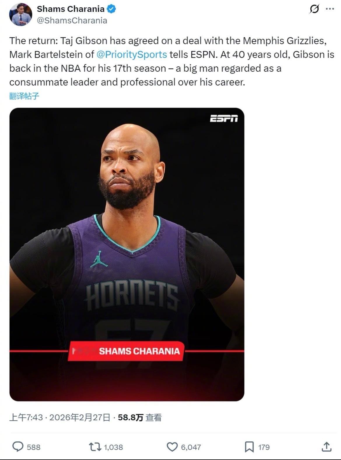 名记Shams报道,泰·吉布森加盟灰熊,40岁的他将重返NBA,签下的是一份两年合同,开启第17个赛季。目前联盟最老前五:詹姆斯(41岁约2个月)、洛瑞(39岁11个月)、坦普尔(39岁9个月)、霍福德(39岁9个月)。吉布森生涯场均贡献8.4分5.7篮板1盖帽。NBA
