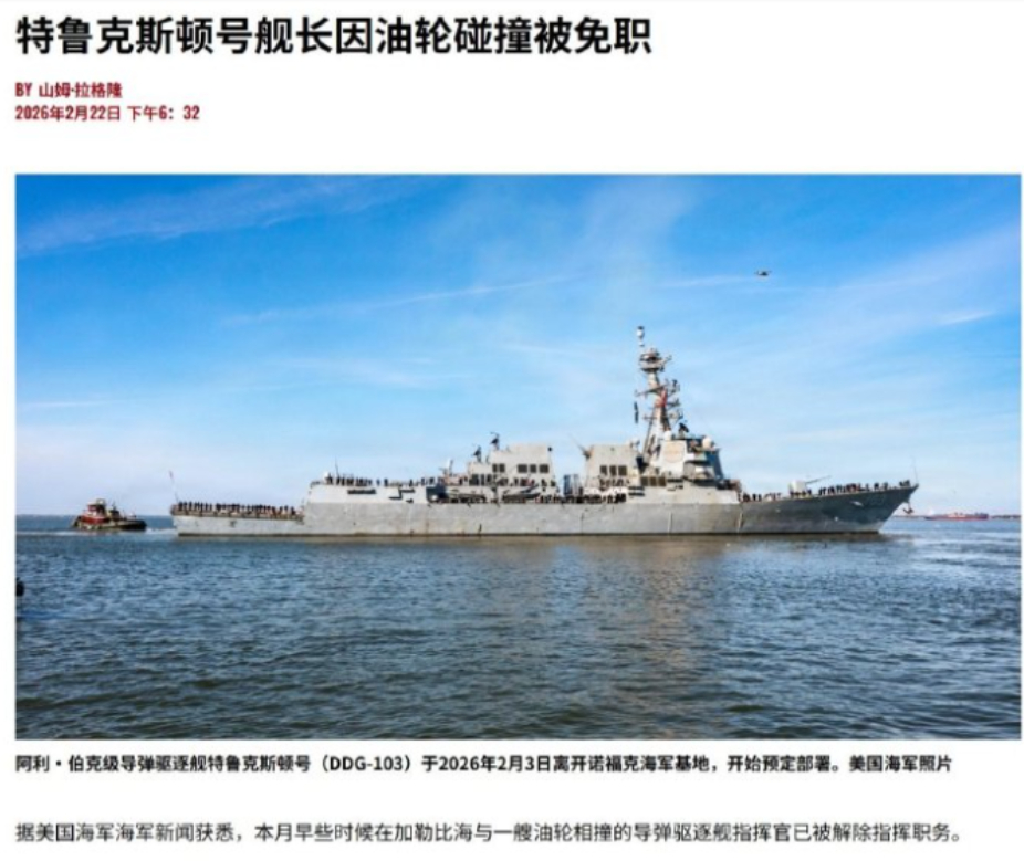 美国媒体2月22日报道称,特鲁克斯顿号舰长因油轮碰撞被免职。原因是2026年2月11日,在加勒比海波多黎各附近海域,阿利·伯克级驱逐舰"特拉克斯顿"号与供应级快速战斗支援舰"供应"号在并行航行时发生刚性碰撞,舰体一侧直接被撞瘪,雷达系统受到波及。第4舰队司令洛斯·萨迪耶洛签署命令,驱逐舰舰长詹姆斯·科菲被解除职务。