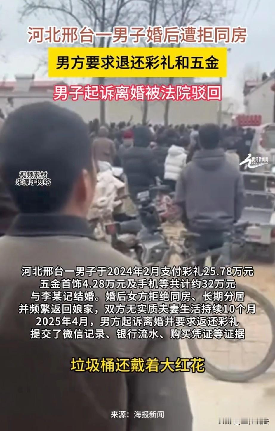 河北邢台,男子花30多万彩礼娶妻,可谁知,妻子婚后一直拒绝同房还频繁回娘家,男子无奈,只能起诉离婚,要求女方退还彩礼。结果妻子反咬一口,声称男子酗酒家暴,导致她抑郁,不离婚也不愿退钱,法院也支持妻子的主张,判决不予离婚。被逼无奈,男子用一招,让女方追悔莫及。 2024年2月,张先生和女子李某登记结婚,这本该是一件让全家高兴的大喜事,没想到,这场婚姻从一开始就埋下了祸根,最后闹得两家人反目成仇。 为了娶到李某,张先生一家可以说是倾尽所有。 按照当地习俗,张家给了李某25.78万元的彩礼,又花4.28万元买了五金首饰,再加上手机、礼品等其他花销,前前后后一共花了将近32万元。 这笔钱对一个普通农村家庭来说,几乎是全部积蓄,甚至还借了不少外债。 张先生和家人满心期待,想着花了这么多钱,终于能娶个媳妇好好过日子,早日传宗接代。 可婚后的现实,给了张先生一家人当头一棒。 妻子李某嫁过来之后,始终拒绝和张先生过夫妻生活,晚上睡觉连衣服都不肯脱,平时也总是找借口频繁往娘家跑,两人长期处于分居状态。 整整10个月时间,两人没有一点实质的夫妻生活,有名无实的婚姻让张先生既委屈又绝望。 他多次尝试和妻子沟通,也多次去娘家劝说,可李某始终态度冷淡,根本不愿意好好维系这段婚姻。 眼看日子实在过不下去,2025年4月,张先生无奈之下向法院提起了离婚诉讼,同时要求女方返还32万元的彩礼和五金首饰。 为了证明自己的说法,张先生准备了充足的证据,包括微信聊天记录、银行转账流水、购买凭证等,他坚信法院会给自己一个公道。 可让张先生万万没想到的是,开庭时李某不仅坚决不同意离婚,还反过来倒打一耙。 李某声称两人感情没有破裂,反而指责张先生没有工作、经常酗酒,还在她生理期强行要求同房,甚至对她家暴,导致自己患上了重度抑郁症,还向法庭提交了医院的诊断证明。 张先生傻眼了,他根本没有酗酒、家暴的行为,李某的说法完全是捏造。 对于家暴的指控,李某也拿不出任何报警记录、伤情鉴定等关键证据,全是单方面的说辞。 即便李某的说辞不靠谱,法院还是认为,李某明确表示不愿意离婚,而张先生提供的证据不足以证明夫妻感情已经完全破裂,最终判决不予离婚,彩礼返还的诉求也没有得到支持。 拿到判决书的那一刻,张先生一家人彻底崩溃了。 花光所有积蓄娶回来的媳妇,不履行妻子义务、不回家、不过日子,现在想离婚离不掉,想拿回彩礼也不可能,一家人实在走投无路。 为了讨一个说法,张先生的家人只能采取最无奈的方式。 他们租来了礼炮车,直接开到李某家门口,当着全村村民的面,把事情的真相说了出来。 张先生的父母诉说着他们的委屈:结婚10个月,李某晚上睡觉衣服都不脱,不跟我儿子过日子就退钱,不退钱又不离婚,这不是坑人吗。 这一闹,很快引来大量村民围观议论,当地相关部门也终于介入调解。 30多万对于普通家庭来说,是一辈子的血汗钱。 婚后拒绝同房、长期分居、既不离婚也不退彩礼,怎么看都违背了婚姻的初衷,这就是赤裸裸的骗婚。 很多人都希望相关部门能够严肃处理,在高价彩礼、骗婚这类问题上做出有温度、有力度的裁决,别让老实人既破财又伤心。 《最高法关于适用〈民法典〉婚姻家庭编的解释(一)》第五条规定:当事人请求返还按照习俗给付的彩礼的,如果查明属于以下情形,人民法院应当予以支持: (一)双方未办理结婚登记手续; (二)双方办理结婚登记手续但确未共同生活; (三)婚前给付并导致给付人生活困难。 适用前款第二项、第三项的规定,应当以双方离婚为条件。 张先生与李某虽登记结婚,但婚后女方长期拒绝同房、频繁回娘家、分居10个月、无实质夫妻生活,这种状态在法律上不构成真正意义上的共同生活。 张先生已提交转账记录、聊天记录等证据,足以证明双方登记结婚但确未共同生活,符合本条第二项彩礼返还的法定条件。 女方以家暴、抑郁为由抗辩,但无报警记录、伤情鉴定等有效证据,不足以推翻未共同生活的事实。 虽然法院以“感情未破裂”不予离婚,导致彩礼返还诉求暂不支持。 但从实体上看,只要张先生后续再次起诉离婚成功,他还是可以主张返还全部或大部分彩礼。