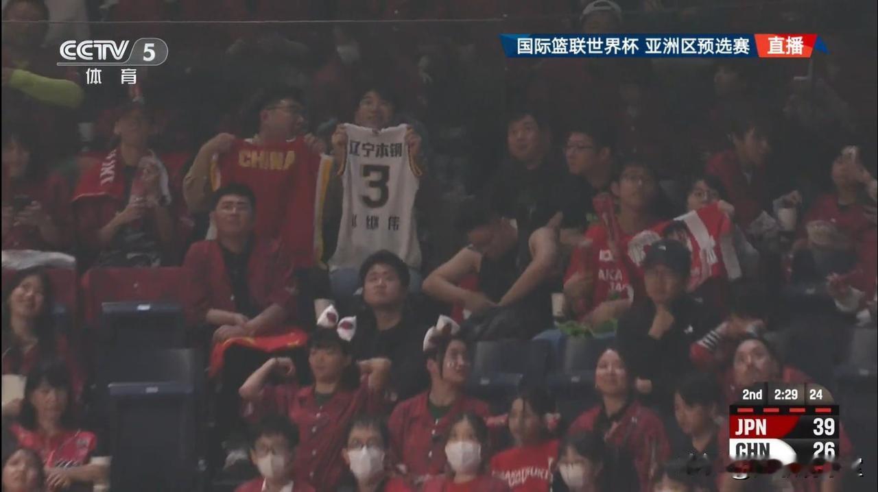 不得不说,日本还是有不少的辽宁球迷的,昨晚的中国男篮与日本的比赛,现场就有举着赵继伟的辽宁队球衣的球迷,比赛暂停期间,直播镜头就直接对准了这位辽宁球迷,只见他举着赵继伟的辽宁队白色球衣坐在日本球迷人群中,格外显眼,因为别人举着的是中国男篮的红色球衣,唯有他是举着辽宁队的白色球衣