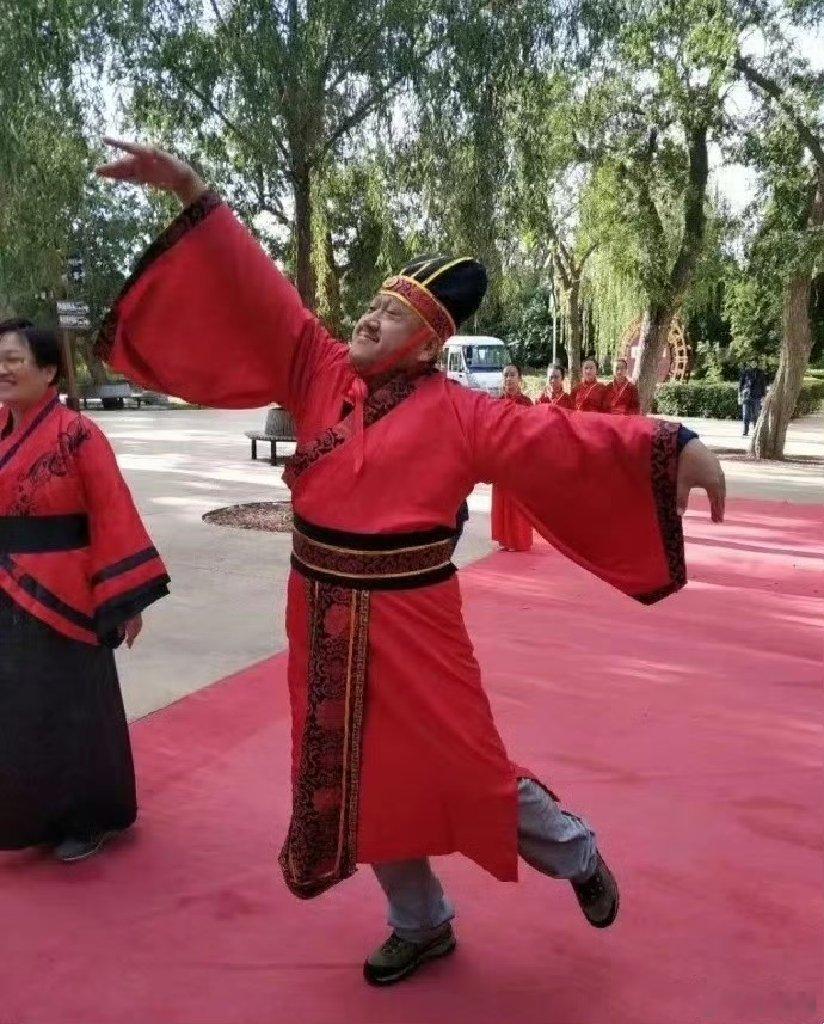 孔庆东老师衣服搭配的牛仔裤和皮鞋,以及夸张的形体,他应该是在进行表演。