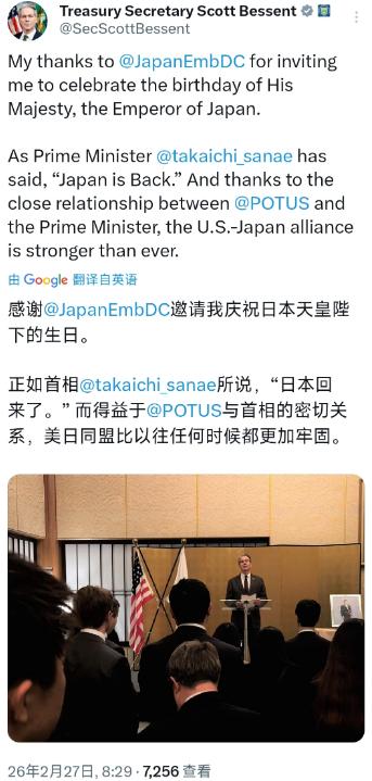 朝令夕改!当面一套背后一套!美国贝森特的态度可真是随风摇摆,前一天还“警告”高市早苗,若是继续这种态度,那她的下场会很“惨”,如今他又要庆祝“日本天皇”的生日,并对美日同盟大肆赞扬,这立场简直是说变就变。 首先咱们要清楚一件事情,那便是在前不久,贝森特就对中日矛盾做出了评价,他以为中日关系发展到今天这步,完全是高市早苗的原因,而如今贝森特又借“日本天皇”生日之名,对美日关系进行了鼓吹。 其实对于美国来说,这很可能是为了先稳住日本,让他们不要继续“搞事情”,毕竟特朗普即将访华,中美双方现在都在做准备,估计谁也不想在这期间闹出什么幺蛾子。 而反观日本,如今越来越多国家选择访华,选择和中国修复关系,可日本却在台湾问题上越红线,可以这么说,若是中日关系继续恶化下去,那日本经济在未来大概率会严重下滑。