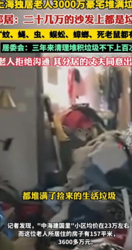 上海,一大妈花3600万,买了157平,单价23万一平的豪宅,却在房子里堆满垃圾,20多万的意大利进口沙发,都用来放垃圾,门外的公共电梯间也被她搞成垃圾场,让整栋楼都充斥着腥臭味,3年来,居委会清理垃圾100多次,就连警方都拿她没办法。很多业主被迫卖房搬家,结局出乎意料。 在上海,单价23万的房子算得上妥妥的顶流豪宅,3600万的房款足以看出大妈的经济实力,周边业主也都注重生活品质,没人料到这位家境优渥的大妈,会做出如此颠覆认知的举动。 大妈买下豪宅后,没有装修成精致居所,反而一门心思收集各种垃圾,吃剩的外卖、废弃塑料袋、捡来的旧杂物,全都一股脑堆进屋里。 偌大的157平豪宅,被垃圾填得满满当当,连走路的缝隙都快没有,那套20多万的意大利进口沙发,更是被当成“垃圾架”,缝隙里塞满污渍和杂物,彻底失去了原本的价值。 久而久之,垃圾长期堆积霉变,豪宅里污秽不堪,刺鼻的腥臭味和霉味混合在一起,隔着房门都能闻到,还滋生了大量蚊子、苍蝇、蟑螂,角落里甚至能看到死老鼠。 更过分的是,大妈还霸占了门外的公共电梯间,堆满废弃物品,导致电梯间通道狭窄、异味弥漫,整栋楼居民深受其害。 业主们每天上下楼都要忍受刺鼻异味,老人小孩出行不便,垃圾长期堆积还存在极大的火灾隐患。有业主多次上门劝说,可大妈要么置之不理,要么态度强硬,甚至放言再劝阻就做出极端行为。 为解决此事,居委会成了最忙碌的一方,三年间上门劝导、清理垃圾不下100次,有时还联动街道特保、民警和社区志愿者开展大型清运,每次都能清理出几十袋垃圾,可前脚刚清理完,后脚大妈就又开始堆积,反反复复无法根治。 业主们无奈求助警方和城管,工作人员多次上门调解、宣讲规定,可大妈始终不为所动,由于没有明确法律依据进行严厉处罚,多方部门也束手无策,陷入“清理—堆积—再清理”的循环。 长期的恶劣居住环境,让不少业主彻底崩溃,有人忍痛低价卖掉精心装修的房子,无奈搬离。有业主透露,自家房子因大妈的行为房价直接缩水,即便降价也鲜有人接手,只能亏损离场。 所有人都以为,大妈的家人会出面劝阻,尤其是她的女儿,可让人匪夷所思的是,她女儿的反应十分冷漠。 居委会费了很大力气联系上她,对方起初言辞恳切,承诺配合处理,可等到工作人员准备上门时,她却突然变卦,撂下“不管母亲的事”,就拉黑所有联系方式,彻底消失,任凭母亲继续困扰邻里。 女儿的冷漠让业主们彻底绝望,不少人吐槽,连亲生女儿都不管不顾,难道真没人能管得了这位大妈?就在大家束手无策、以为事情会一直僵持时,结局出现了反转。 居委会没有放弃,经多方打听,终于联系上了大妈的丈夫。原来,大妈和丈夫因生活习惯不同长期分居, 得知妻子的所作所为后,丈夫十分配合,主动和居委会约定见面,承诺劝说大妈体检就医、配合清理垃圾,帮她改掉堆积垃圾的习惯。 大妈没有相关精神疾病在册记录,堆积垃圾只是个人生活习惯所致。在丈夫的耐心劝说和居委会的配合下,大妈终于同意清理垃圾。 工作人员再次上门开展全面清运,不仅清理了屋内所有垃圾,还彻底打扫了电梯间公共区域,困扰整栋楼三年的难题终于得到解决。 曾经污秽不堪的豪宅慢慢恢复原貌,电梯间也变得干净整洁,刺鼻异味彻底消失,那些被迫搬家的业主得知消息后,也纷纷感慨终于能安心回家了。 对此,你们有什么看法,欢迎评论留言~