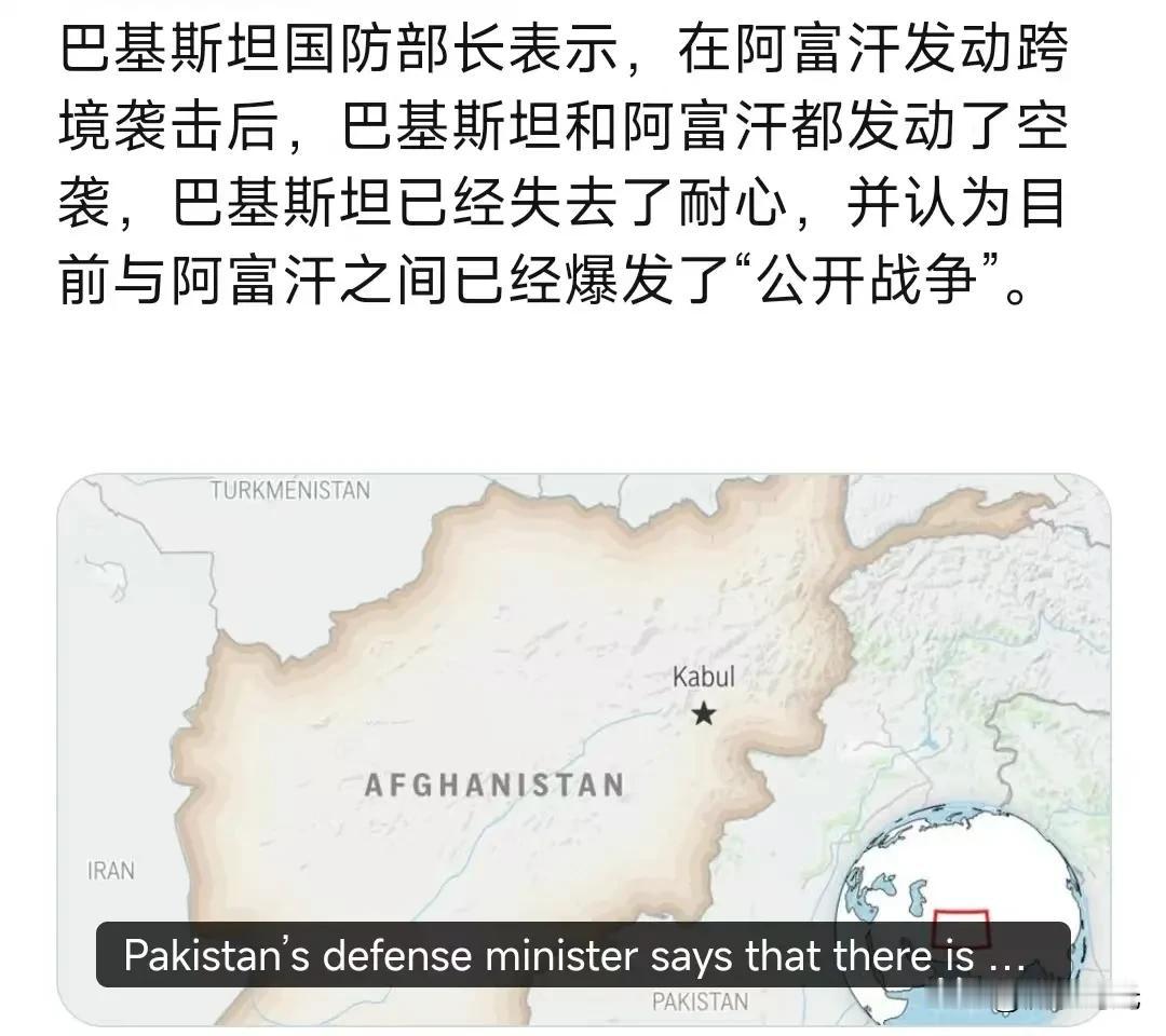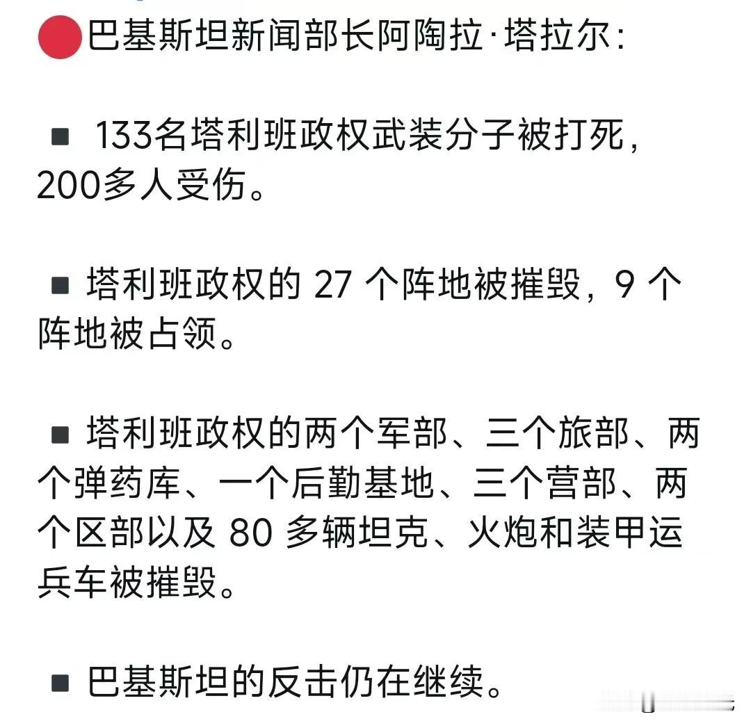 巴基斯坦新闻部长阿陶拉·塔拉尔:133名塔利班政权武装分子被打死,200多人受伤。塔利班政权的27个阵地被摧毁,9个阵地被占领。塔利班政权的两个军部、三个旅部、两个弹药库、一个后勤基地、三个营部、两个区部以及80多辆坦克、火炮和装甲运兵车被摧毁。巴基斯坦的反击仍在继续。 巴基斯坦国防部长表示,在阿富汗发动跨境袭击后,巴基斯坦和阿富汗都发动了空袭,巴基斯坦已经失去了耐心,并认为目前与阿富汗之间已经爆发了“公开战争”。 据巴阿两国官员称,周四,喀布尔方面发动了所谓的“报复性行动”,导致至少8名阿富汗士兵和2名巴基斯坦士兵丧生。 喀布尔方面表示,为报复巴基斯坦周日的空袭,阿富汗方面发动了边境打击,随后爆发了新的冲突。 阿富汗官员称,巴基斯坦的空袭造成多人死亡。 对此,安全部门消息人士称,巴基斯坦军队对喀布尔、坎大哈、帕克蒂亚和楠格哈尔省进行了空袭。 联合国秘书长安东尼奥·古特雷斯敦促双方按照国际法要求保护平民,并“继续寻求通过外交途径解决任何分歧”,联合国发言人斯特凡·杜加里克表示。巴基斯坦