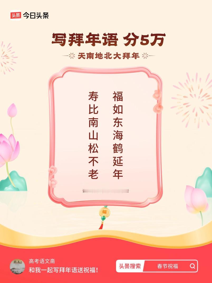 写拜年语送祝福新春拜年送祝福!我的祝福是:“寿比南山松不老,福如东海鹤延年”!快来一起写祝福吧戳这里,一起领红包>
