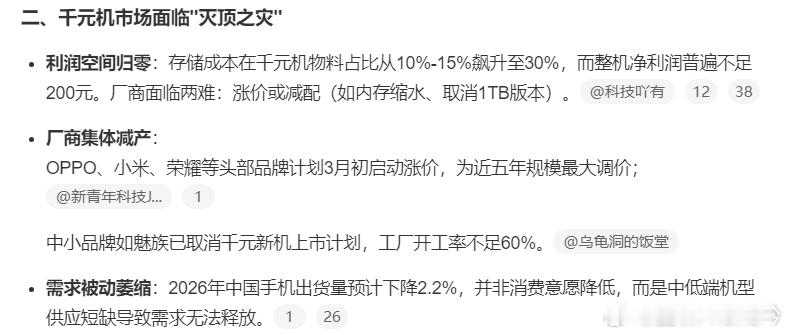 千元机或将消失 完全消失也不太可能,而且很多品牌的主力出货机型都在1-2K价位。顶多内存存储规格降一降,再加上国补,千元机保证日常应用流畅使用还是没问题的。芯片涨价原因