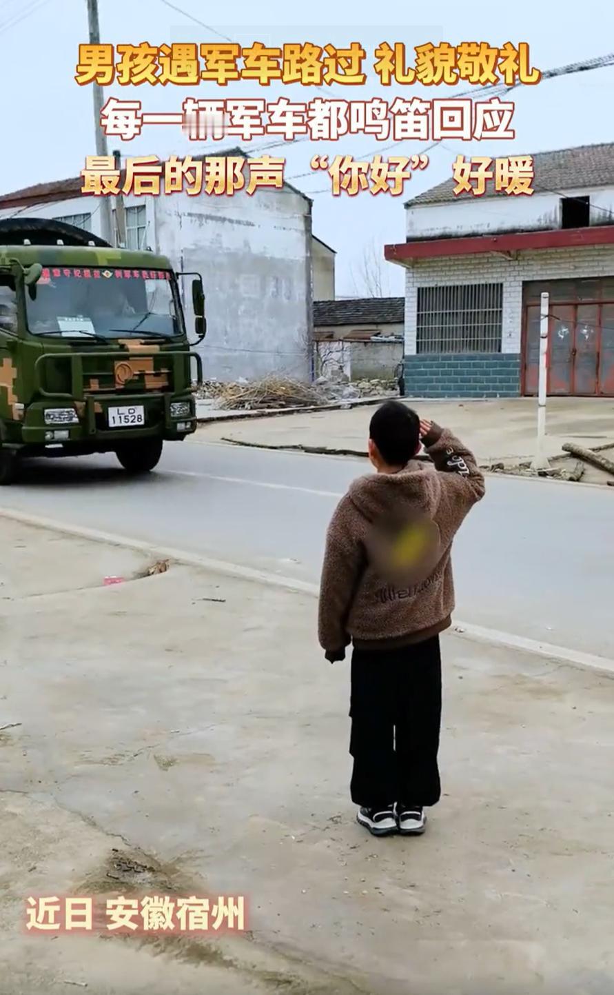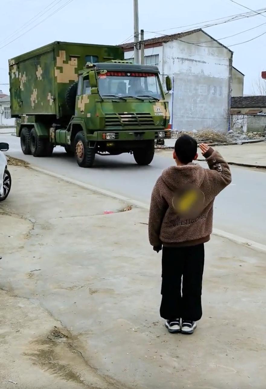 破防了!安徽宿州,男孩假期到爷爷奶奶家,在门口玩耍时,突然发现门口有军车路过,原本嬉皮笑脸的孩子突然严肃起来,对着每一辆路过的军车敬礼,而军车则是用鸣笛的方式进行回礼,这一幕也是看哭了无数网友 男孩正是爱跑爱闹的年纪,在门口玩得不亦乐乎,忽然,远处传来军车行驶的声音。孩子抬头看了一眼,脸上的表情瞬间变了,笑意褪去,取而代之的是认真 他停下正在玩耍的动作,站直了身子,抬起右手,每路过的一辆军车,他就会认真严肃敬一个标准的礼 军车驶过,鸣笛回应。不是一辆,而是一辆接一辆,每一辆经过都鸣笛。孩子则是一直站在原地重复着敬礼的动作,直到车队全部驶过,他又回到了之前的那个童真,继续蹦蹦跳跳起来 这一幕,刚好被家人看到,于是悄悄拍下来发到了网上 有网友说:好暖心啊!少年强则国强具象化了 其实让人动容的不是敬礼这个动作本身,而是那种纯粹。孩子的世界里没有那么多复杂考量,他看见军车,觉得应该敬礼,就敬了。这种下意识的反应,往往才是最真实的 这件事也让人想起这些年看到的类似画面。大街上遇到军人的孩子突然敬礼,路过的军人回礼后继续前行;升旗仪式时原本打闹的孩子立刻站定;国歌响起时正在跑的孩子停下来面向国旗方向。这些都不是刻意安排的,就是孩子们自然而然的反应 少年强则国强,其实也可以反过来看,国强,少年才能有这种自然而然的样子 男孩遇军车路过敬礼 军车鸣笛回应