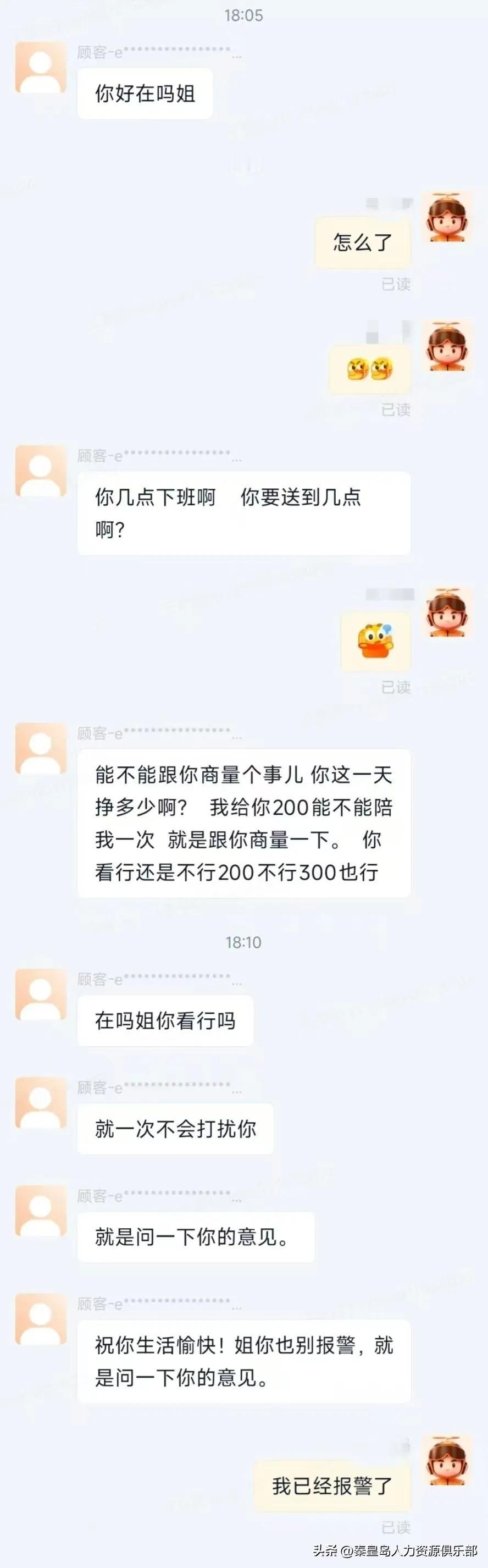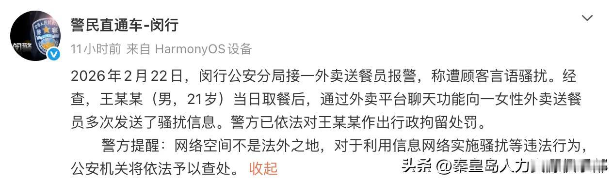 就前几天,上海闵行一个21岁的小伙子王某某,点了个外卖,女骑手小葛爬五楼给他送上去。结果人姑娘刚转身,他反手就在平台聊天里发恶心话——先问人家一天挣多少,接着居然说“给你200能不能陪我一次”,还讨价还价“300也行”! 这可是工作时间啊!咱们送外卖的,虽然辛苦,但也是凭本事吃饭,谁稀罕你那两百三百块钱?这种话简直是对咱们人格的侮辱! 小葛当时肯定吓坏了,但她没怂,直接回了一句“我已经报警了”。结果这男的还不死心,发了一堆消息求原谅,说请吃饭,半小时发了57条,简直像疯狗一样。 好在咱们闵行公安分局给力,直接把这男的行政拘留了!这处理速度,必须给个大大的赞! 说实话,看到这种新闻真的挺后怕的。咱们骑手在外面跑,尤其是女骑手,真的太不容易了。希望大家都能多一份尊重,少一点骚扰。遇到这种事儿,咱们也得像小葛一样,该报警报警,别忍气吞声!工作不分贵贱,人格不容侵犯!姐妹们遇到骚扰都学学小葛,硬气一点,法律和警察都在咱这边! 顺便也给那些动歪心思的人提个醒:网络不是法外之地,隔着屏幕耍流氓照样拘你没商量!大家觉得这男的拘留几天合适?评论区聊聊!