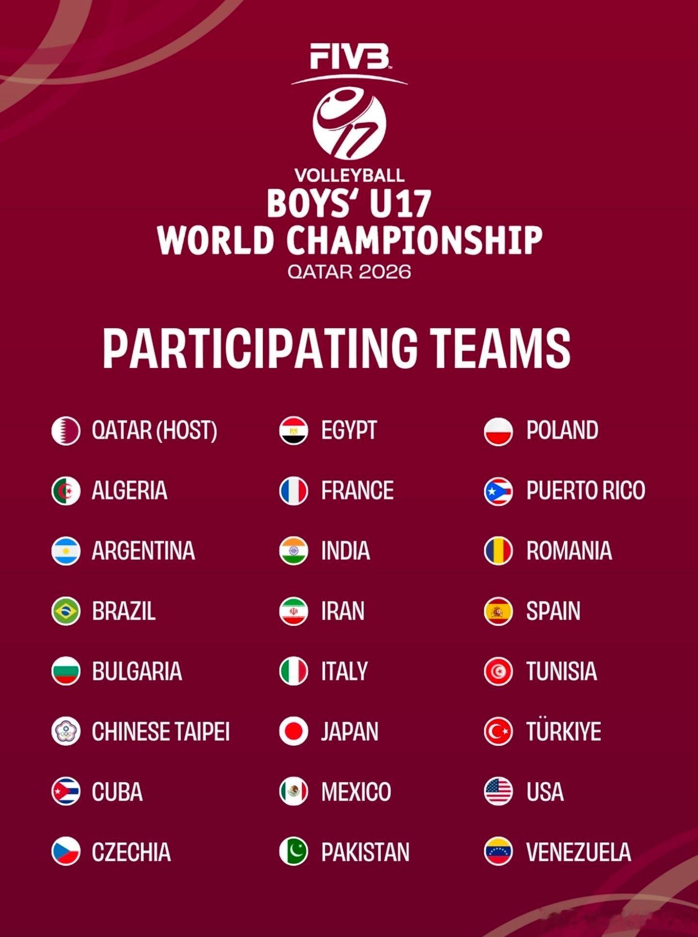 👇 参加2026年8月19日至29日在卡塔尔多哈举行的U17男子世界锦标赛的24支参赛队伍,抽签仪式将于2026年3月18日举行。中国U17男排连续第二届无缘。