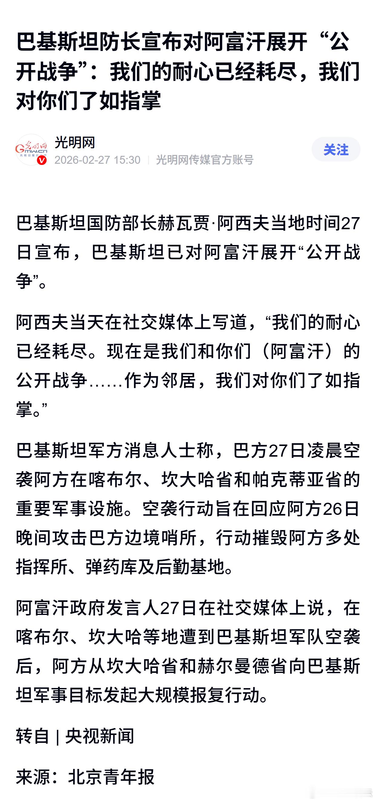 巴基斯坦防长宣布对阿富汗展开“公开战争”:我们的耐心已经耗尽,我们对你们了如指掌