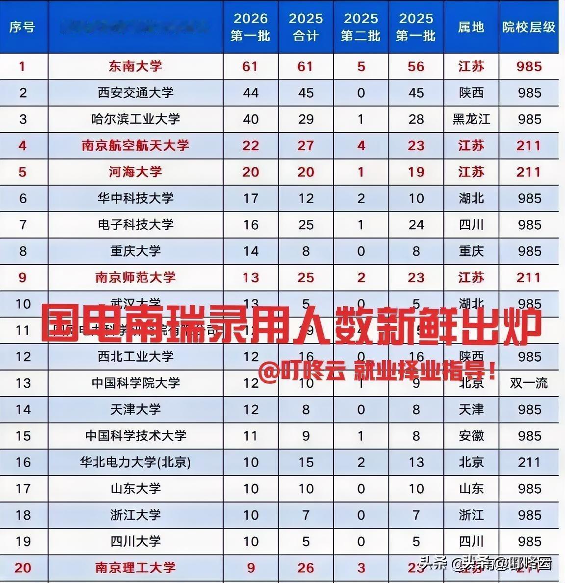 争碗有多惨烈?国网南瑞25~26校招录用人员背景排行榜揭秘!南瑞校招红榜炸场,本地生源霸榜!@叮咚云 帮你解读重点和职业规划指导:东南大学、西安交通大学、哈尔滨工业大学三所985毕业生惨烈胜出,南京本地高校毕业生赢得胜利!2026南瑞集团春招er,速抄“上岸密码”!这哪里是名单,分明是春招人的“上岸导航仪”![烟花][烟花][点亮平安灯][点亮平安灯] 国网南瑞2025-2026校招录用榜新鲜出炉!录用人员背景数据不会说谎,东南大学以61人的断层优势霸榜,堪称“南瑞预备役总部”;西交、哈工大紧随其后,985院校依旧稳坐“铁饭碗”主赛道。但最绝的是“双非杀手”不存在,211院校杀疯了——南航、河海、南师大等江苏本土211,凭借地域buff+专业契合,录用数吊打一众外地985,南理工更是以26人的合计数,上演“211逆袭名场面”。[福][福][烟花][烟花] 春招在即,与其盲目海投,不如精准卡位。“宝剑锋从磨砺出”,想进南瑞这扇门,院校是敲门砖,专业匹配才是硬通货。江苏学子近水楼台先得月,外省同学则要锚定985光环+电力相关专业。别再感慨“卷不动”,红榜已划好重点:要么凭985学历硬刚,要么靠地域+专业精准突围。2026春招号角已响,找准赛道,“直挂云帆济沧海”,下一个入职南瑞的就是你![啤酒][啤酒][得意][得意] 欢迎关注@叮咚云 将优先为粉丝职业规划指导,为你定制最适合的就业择业方案!欢迎留言交流讨论。[来看我][来看我] 免责声明:图片来自网络,仅供参考 春招招聘岗位 央国企招聘 国企央企招聘 军工央国企招聘 央国企求职招聘国家电网求职