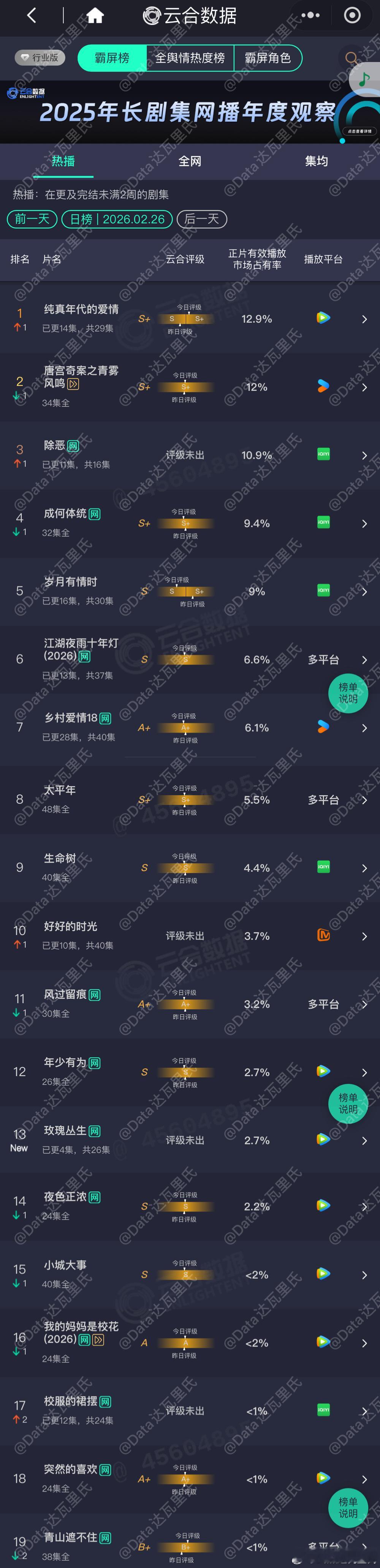 2.26云合占比(估值一会出)纯真年代的爱情12.9% 云合登顶,评级升级至S+唐宫奇案 12%除恶 10.9%成何体统 9.4%岁月有情时 9%,评级降至S玫瑰丛生 首播2.7%