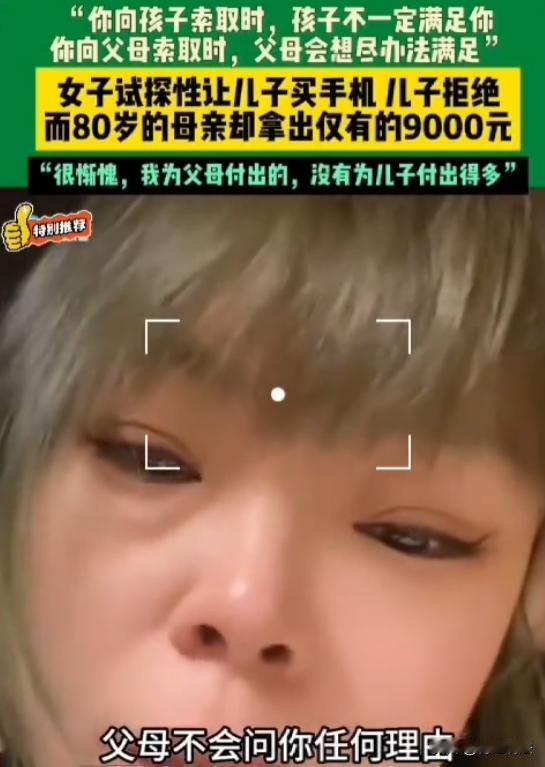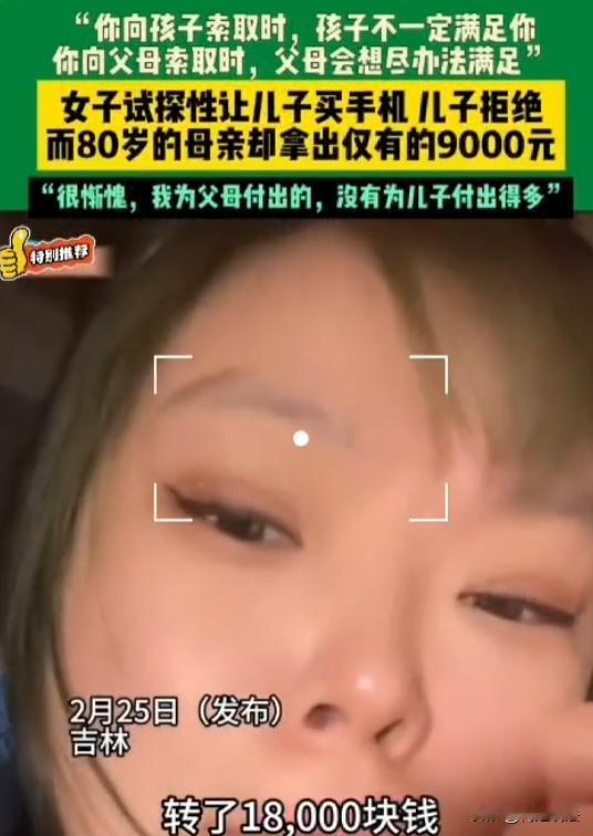 吉林,女子收到儿子转来的18000块,说是让帮忙存着。这女子突然就冒出个念头,想试探试探儿子,就说自己手机旧了,想拿这钱买个新苹果。儿子一听,脑袋摇得跟拨浪鼓似的,直说钱攒得不容易,不能买。女子心里有点小失落,跟儿子说是开玩笑。下午,女子去80多岁老母亲家,又跟母亲说想买手机,让给一万块。母亲面露难色,说钱不够,可还是去拿钱,要把9000块全给女儿。 早上女子刚醒没多久,手机就震了一下。 点开一看,是儿子转的钱,18000,附言就俩字,存着。 养他这么大,从小到大,好吃的好用的,从来没亏过他。 鬼使神差的,就想试试他。 电话里语气故意放软,说自己手机卡得不行,想拿这钱换个新苹果。 电话那头沉默了两秒,接着就是一连串的拒绝,儿子的声音很急,说那钱是他攒了大半年的,起早贪黑熬出来的,不能乱花。 女子听完,心里一下子就凉了半截,明明是他让我帮忙存的钱,只是随口一提,他就这么紧张。 赶紧打圆场,说跟他开玩笑,哪能真花他的辛苦钱,挂了电话,半天没缓过神。 中午饭也没吃多少,越想越不是滋味,索性换了衣服,往老母亲家走。 老母亲今年八十多了,身子还算硬朗,就是手里没多少闲钱,一辈子省吃俭用,攒点钱都想着儿女。 到了母亲家,坐下聊了几句家常,女子又提起买手机的事,没敢说要18000的苹果,就说想要个普通的,让她给一万块。 母亲愣了一下,脸上露出难色,小声说自己没那么多钱,女子赶紧说没事,就是随口说说,不用放心里去。 可女子话音刚落,母亲就慢慢站起身,挪着小碎步,走到里屋的柜子前,她打开最下面的抽屉,从一个旧布包里,慢慢数着钱。 都是些零钱,一块、五块、十块的,凑在一起,整整9000块。她把钱递到女子手里,说就这些了,不够的话她再想想办法。 女子看着母亲布满皱纹的手,还有那叠带着体温的零钱,眼泪一下子就掉下来了。 儿子拒绝女子,或许真的是因为钱来得不容易,可母亲愿意掏光所有,只是因为女子是她的女儿。 这事越想越扎心,不光是情感上的落差。 很多人说,这就是家务事,谈不上法律。 可真的是这样吗?母亲掏养老钱给女儿,儿子不愿出钱给母亲买手机,这里面到底有没有法律义务? 如果母亲晚年生活困难,儿子不履行赡养义务,能起诉他吗? 《民法典》第1067条规定,成年子女不履行赡养义务的,缺乏劳动能力或者生活困难的父母,有要求成年子女给付赡养费的权利。 说白了,就是子女养老人,天经地义。 不管子女有没有钱,只要父母缺乏劳动能力、生活困难,就必须尽赡养义务。 这里的赡养,不只是给赡养费,还包括生活上的照料和精神上的慰藉。 就拿女子只是试探儿子来说,还没真的要他出钱买手机,儿子的拒绝不算不履行赡养义务。 但如果女子晚年生活困难,没有收入,儿子就必须按月支付赡养费,哪怕他的钱来得不容易。 据《老年人权益保障法》第11条规定,赡养人应当履行对老年人经济上供养、生活上照料和精神上慰藉的义务,照顾老年人的特殊需要。赡养人是指老年人的子女以及其他依法负有赡养义务的人。 赡养义务是法定的,不能因为任何理由拒绝。 哪怕父母有自己的积蓄,哪怕父母曾经偏心,子女都不能免除赡养义务。 就像案例里的老母亲,自己攒点养老钱,却愿意全部给女儿,这是母亲的自愿,不是她的义务。 容易混淆的是,父母对子女的付出,不是义务之外的馈赠,而子女对父母的赡养,却是必须履行的责任。 女子把最好的都给了儿子,是出于母爱,但儿子长大后,对母亲的赡养,不是报恩,是法律规定的义务。 如果儿子就是不履行赡养义务,母亲该怎么办? 很简单,可以直接起诉,要求儿子支付赡养费、履行照料义务。 法院会依法判决,只要证据充足,母亲一定能胜诉。 总在忙着爱自己的孩子,却忘了那个把我们从小养大、默默付出的父母。 父母的爱,从来都是毫无保留的。 而子女对父母的爱,不该带着理智,不该计较得失。 法律规定的赡养义务,只是底线,真正的孝顺,是发自内心的关心和陪伴。 如果你是这个女子,被儿子拒绝后,会难过吗? 如果你是这个儿子,会同意给母亲买手机吗? 你觉得,子女对父母的孝顺,到底该怎么体现?一起来说说你的看法。