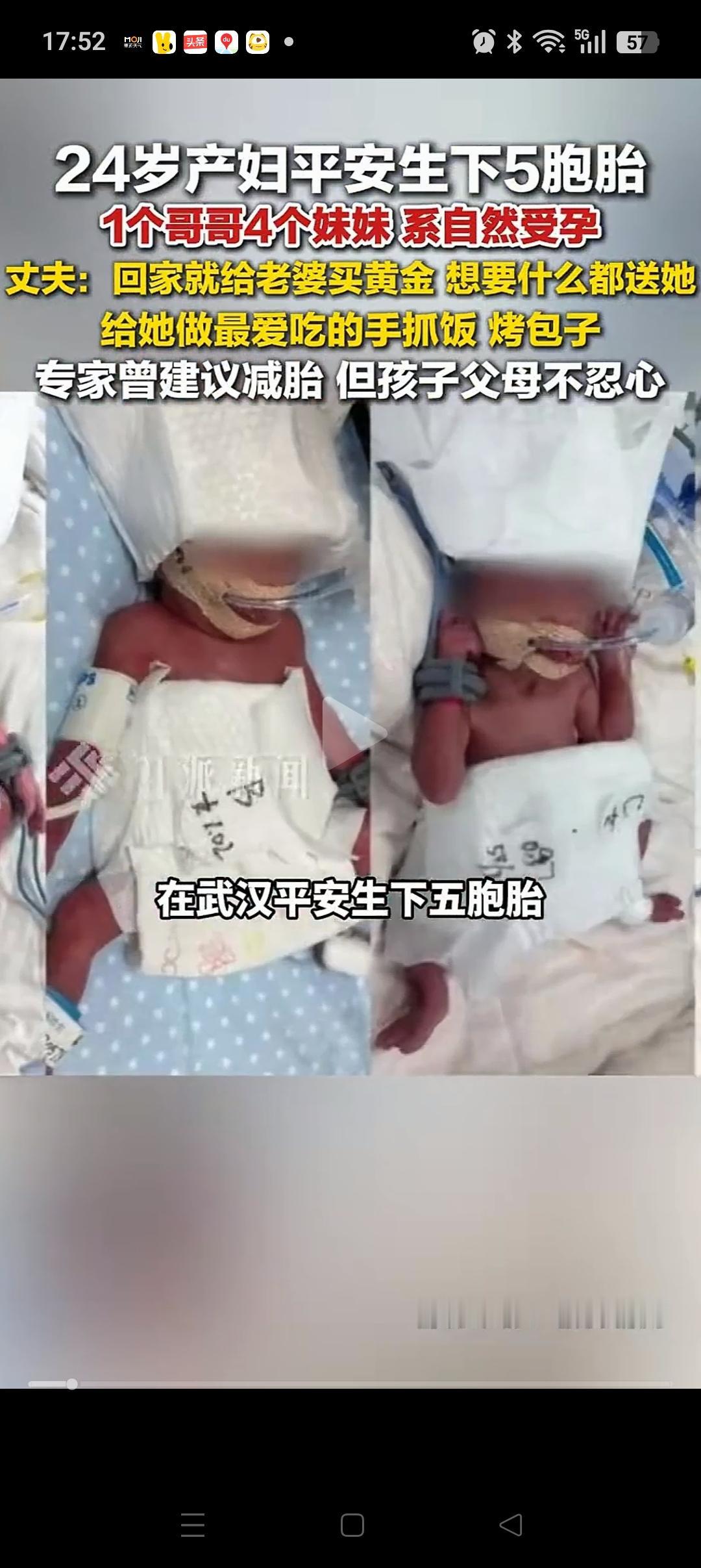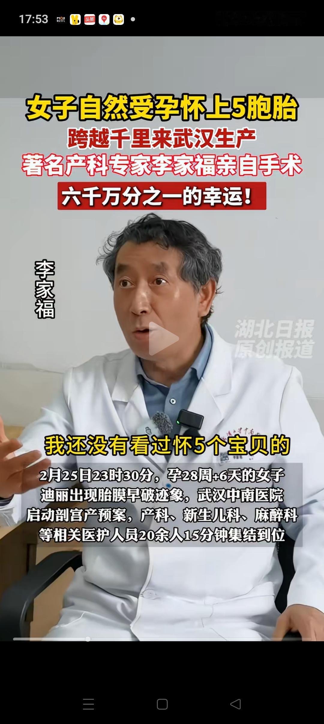 一觉醒来, 被人民日报的消息给震撼到了! 没想到:24岁的新疆妈妈在武汉创下了六千万分之一概率的奇迹,生下了5胞胎,1男4女,且都很健康。 为她接生的正是李家福,相信很多人都认识他。不仅医术好,医德更好,看了他的纪录片就没有不流泪的[流泪][流泪],是个很好的人。。 本来医院曾经建议爸爸妈妈减胎的,但是他们考虑再三,还是觉得应该都生下来。毕竟那都是他们的孩子,舍不得。 他们千里迢迢来到武汉是对的,感谢李家福,感谢这位伟大的妈妈[玫瑰][玫瑰]。。