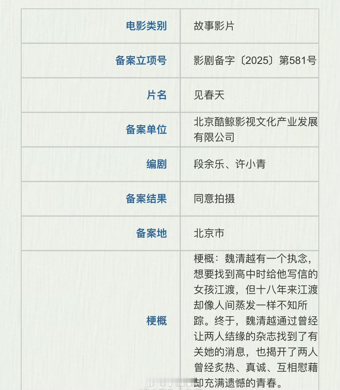 电影《见春天》陈飞宇、王影璐 三月开机🍠编剧:段余乐《一闪一闪亮星星》开机时间:3月上旬拍摄周期:1个半月简介:魏清越有一个执念,想要找到高中时给他写信的女孩江渡,但十八年来江渡却像人间蒸发一样不知所踪。终于,魏清越通过曾经让两人结缘的杂志找到了有关她的消息,也揭开了两人曾经炙热、真诚、互相慰藉却充满遗憾的青春。