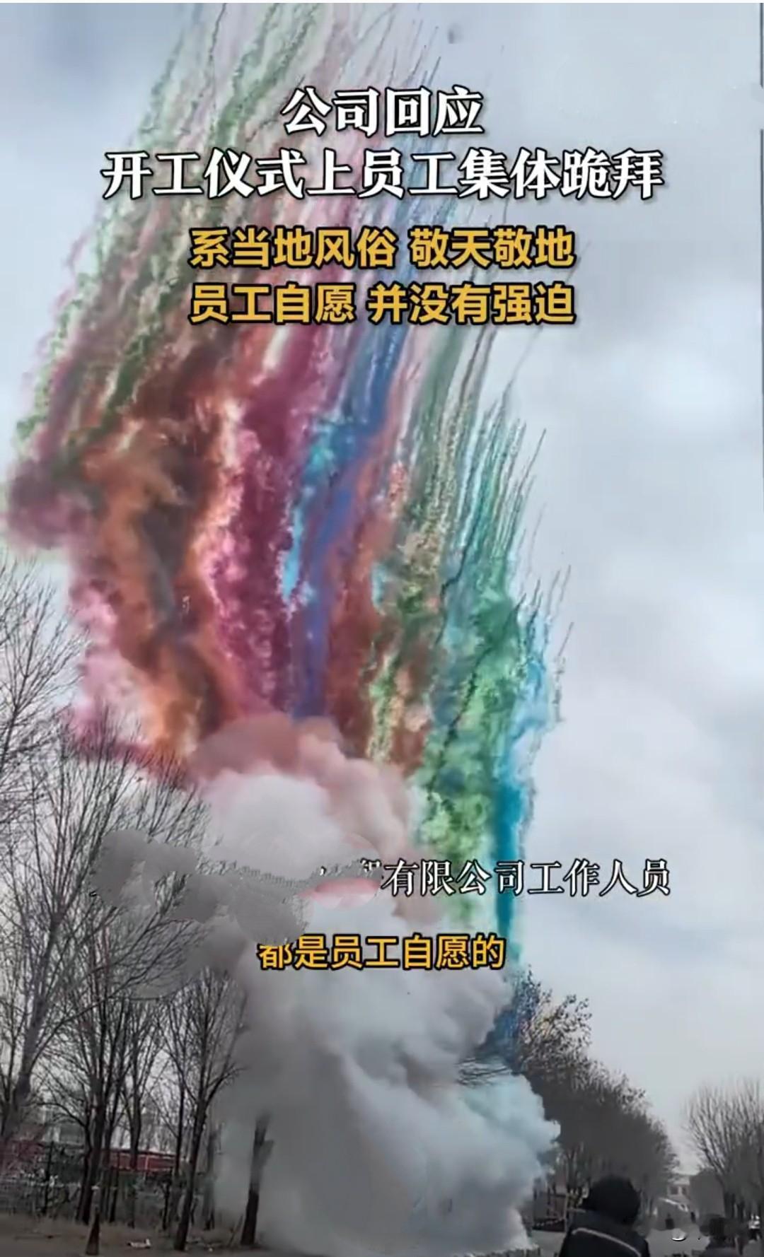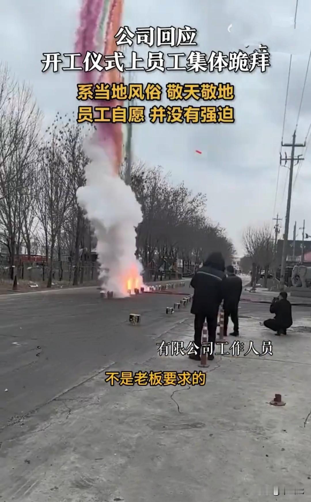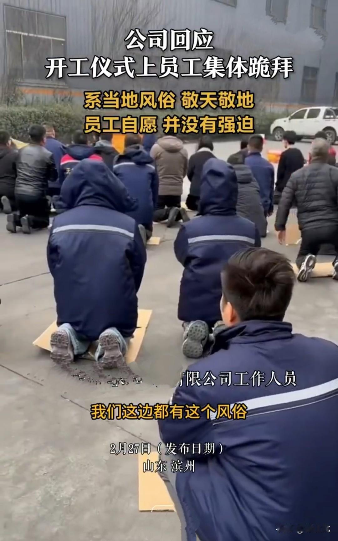 山东某工厂举行开工仪式,在燃放烟花的同时,员工跪在地上敬天拜地,有些人膝盖下面垫一张纸板,有些人什么都没有垫,就这样跪在冰冷的水泥地板上。 放眼望去,空地上跪满了穿着工作服的工人,不明真相的人看到,还以为是在举行某种封建祭祀仪式。 厂方回应:确有此事,敬天敬地是当地风俗,没有强迫,员工都是自愿。 一说就是自愿,自愿真是一个好词呀。 可不自愿能行吗? 所有人包括老板都跪着,就你一个人站着,想搞特立独行,还是藐视天地。 在老板眼中,你就是一个不服管理的刺头儿,不是被穿小鞋,就是被扣工资。 不信的话,你站着一个试试。 (素材来源:荔枝新闻)