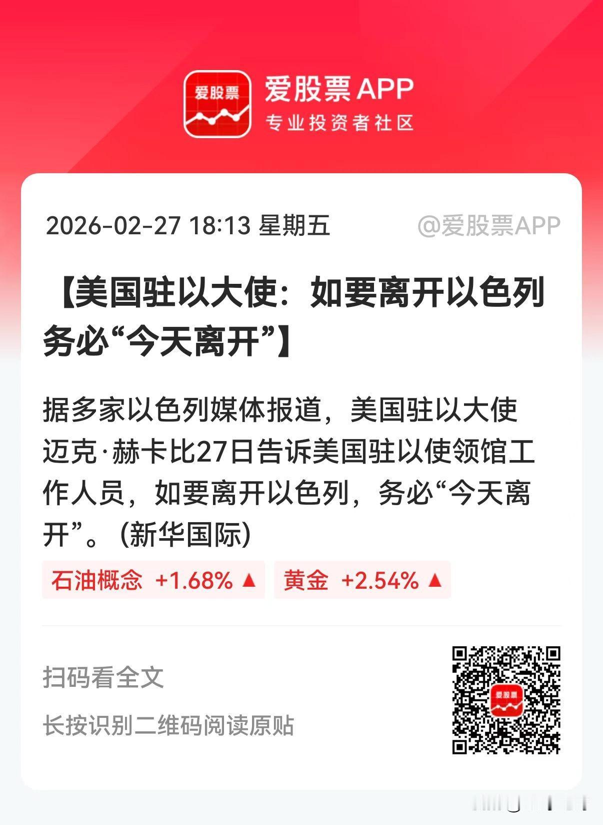重大利好!原油期货直线拉升,下周A股油气开采板块有戏? 美国驻以大使刚刚告诉美国驻以色列大使馆工作人员,如果要离开,务必“今天就离开”! 同时,我国也开始发布公告,提醒中国公民暂勿前往伊朗,在伊朗的中国公民也建议尽快撤离。 为此,布伦特原油期货直接直线拉升! 这么来看,周末美国难道要对伊朗动手了? 这个概率不排除! 虽然美国和伊朗才谈完,但是分歧巨大,而且老特也需要一场胜利来巩固他的支持率。 现在原油期货这么大幅拉升,无疑是嗅到了不一样的味道! 油气开采板块下周有望迎来表现了!