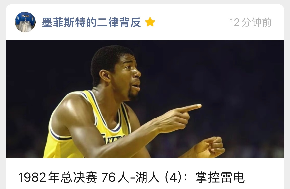 想了一下1982年总决赛的结尾,一琢磨,如果写一个积极的结尾就是连续三个系列赛都是积极的了。然后,我想到了一个更好的结尾,就把之前想的给去了。可能我就不是一个积极的人吧:如果换个人写1997总决赛,他一定会写出五冠王乔丹的英姿,我结尾却是写的斯隆老婆得癌症;如果换个人写1991总决赛,他一定会着笔于霸权更替,但我tm狗尾续貂的写了个乔丹法则与艾滋的结尾——事实证明,狗屎一坨;如果换个人写1996西部决赛,他一定会着笔于晋级的超音速与他们即将面对的不可战胜的公牛,而我选择写马龙资助白血病儿童病逝;如果换个人写1994总决赛,其实到奥拉朱旺开车去清真寺就结束了,但是——这次好像不是画蛇添足——我选择介绍94年总决赛后对规则的影响;最经典的是1980年总决赛了,是个人都会着眼于魔术师、贾巴尔、80年代的到来作为结尾,我却选择在最后再用一千字写麦金尼。这就像别人跨年放炮,你跨年烧纸,未尝不可,但总觉得有点怪