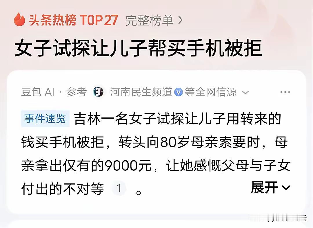 这个故事深刻描绘了父母与子女之间爱与付出的不同层面,感人至深,也引发了社会对亲情关系的反思。简要总结和分析如下: 故事概要 女子儿子转给她18000元让她帮忙存着。 女子试探儿子借钱买新手机,被儿子婉拒,说明儿子看重自己的积蓄。 女子随后去80多岁的母亲家,试探向母亲借1万元买手机。 母亲虽然钱不多,但二话不说把家中9000多块钱拿出来给她花。 女子看到母亲的无私付出,感动落泪,也深刻反省与领悟父母与子女间爱的差别。 主要感悟 父母的爱是无私和本能的 老母亲即使自己年迈且手头拮据,仍然毫不犹豫倾尽所有去满足女儿的需求,这种爱不计较条件,不求回报,是父母对子女的天性体现。 子女的爱往往更理性和自我保护 儿子节衣缩食攒钱,拒绝用在母亲身上,体现的是年轻人对资源的谨慎分配和理性权衡,不代表不孝,而是还未完全理解父母的无私。 爱有“倾斜”性和“层次”差异 父母向子女的爱是“向下倾斜”的,无论子女多大,对父母来说永远是需要被保护和支持的。而子女的爱需要时间和阅历去成长,才会变得无私。 感恩与孝顺的反思 女子感叹自己对儿子的付出多于对母亲,提醒我们在承担对子女责任的同时,也要记得关爱和照顾长辈。 法律理性视角 从《民法典》第657条看,财产赠与是自愿行为,儿子或母亲的钱都属于他们自身的财产权,任何财产转让都应基于自愿和尊重。 社会启示 不应用金钱多少衡量爱与孝顺的深浅,亲情更多是感情和责任的体现。 父母无条件付出,是因为经历和天性,但子女也需要成长理解这份爱。 家庭内部沟通和理解尤为重要,避免因为试探或误解而伤害感情。 子女理性理财和节约也是一种成熟表现,值得被尊重。 总结 这则故事温暖而现实,提醒人们珍惜父母的无私关爱,同时也理解年轻一代的理性和自我保护心态。孝顺不是单纯物质给予,而是爱和责任的多维平衡。多尽孝道,感恩父母,才是温馨家庭的基石。对父母情感 子女的孝心