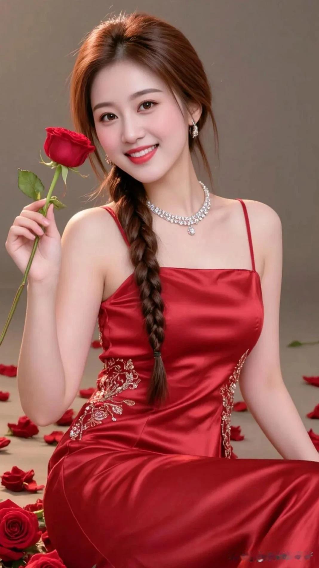 红裙轻曳映娇容, 金绣流光盼相逢。 手捧玫瑰凝眸望, 眼波流转意千重。 精心妆扮为君艳, 独倚芳丛待晚风。 只盼良人今夕至, 一怀心事付怀中。