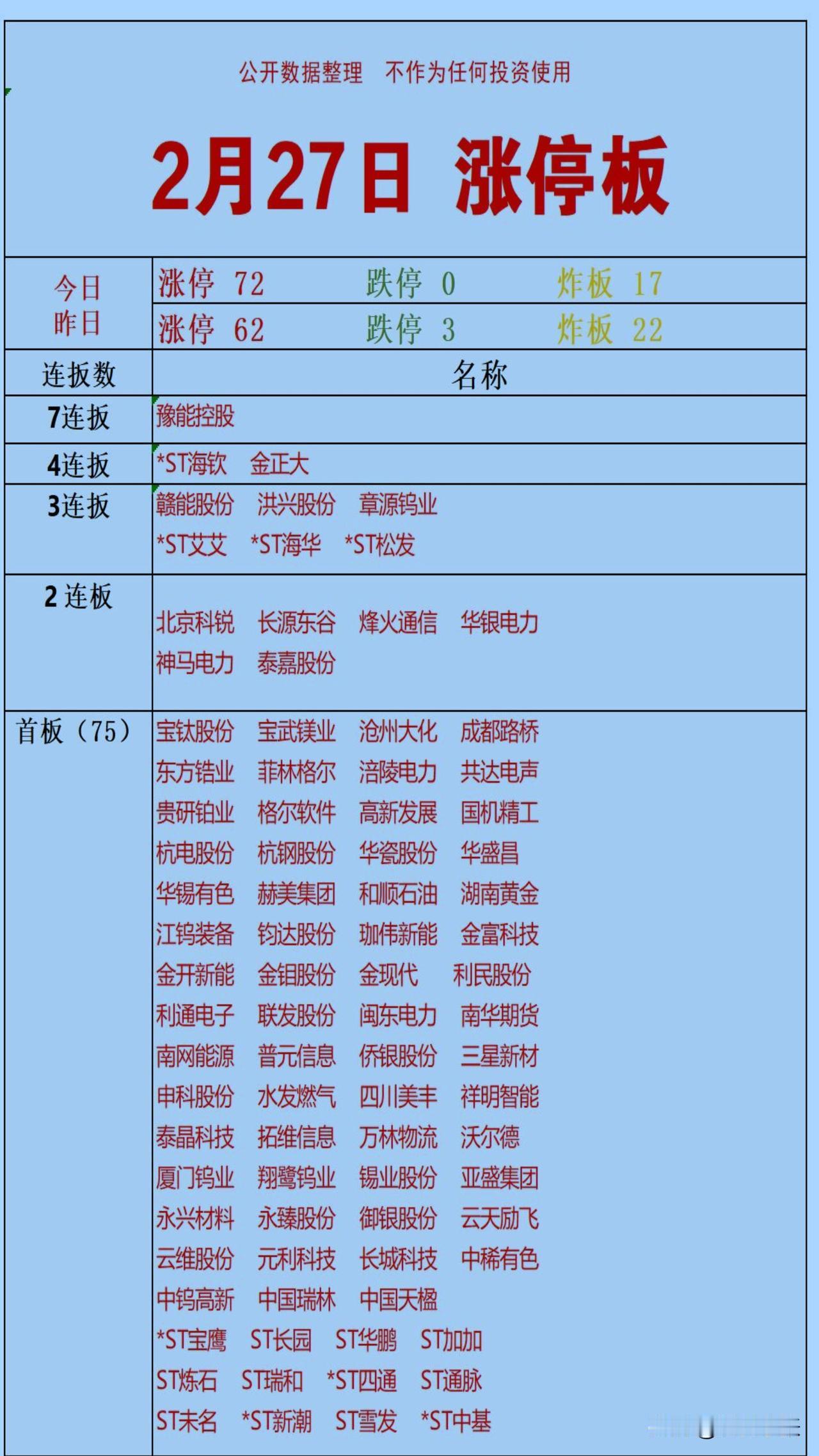 2月27日A股涨停潮来袭! 今日涨停72家,炸板17家,市场情绪明显回暖。 连板梯队方面,豫能控股强势7连板领衔,ST海钦、金正大4连板紧随其后,赣能股份等6股实现3连板。 首板股多达75只,钛金属、电力、稀有金属等板块表现亮眼,ST板块也集体活跃。短线资金聚焦高连板与题材主线,后续可重点关注板块持续性与龙头股走势。