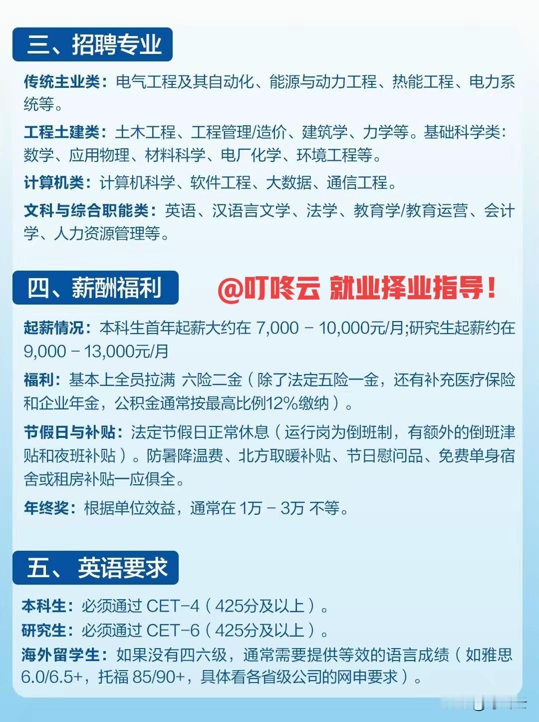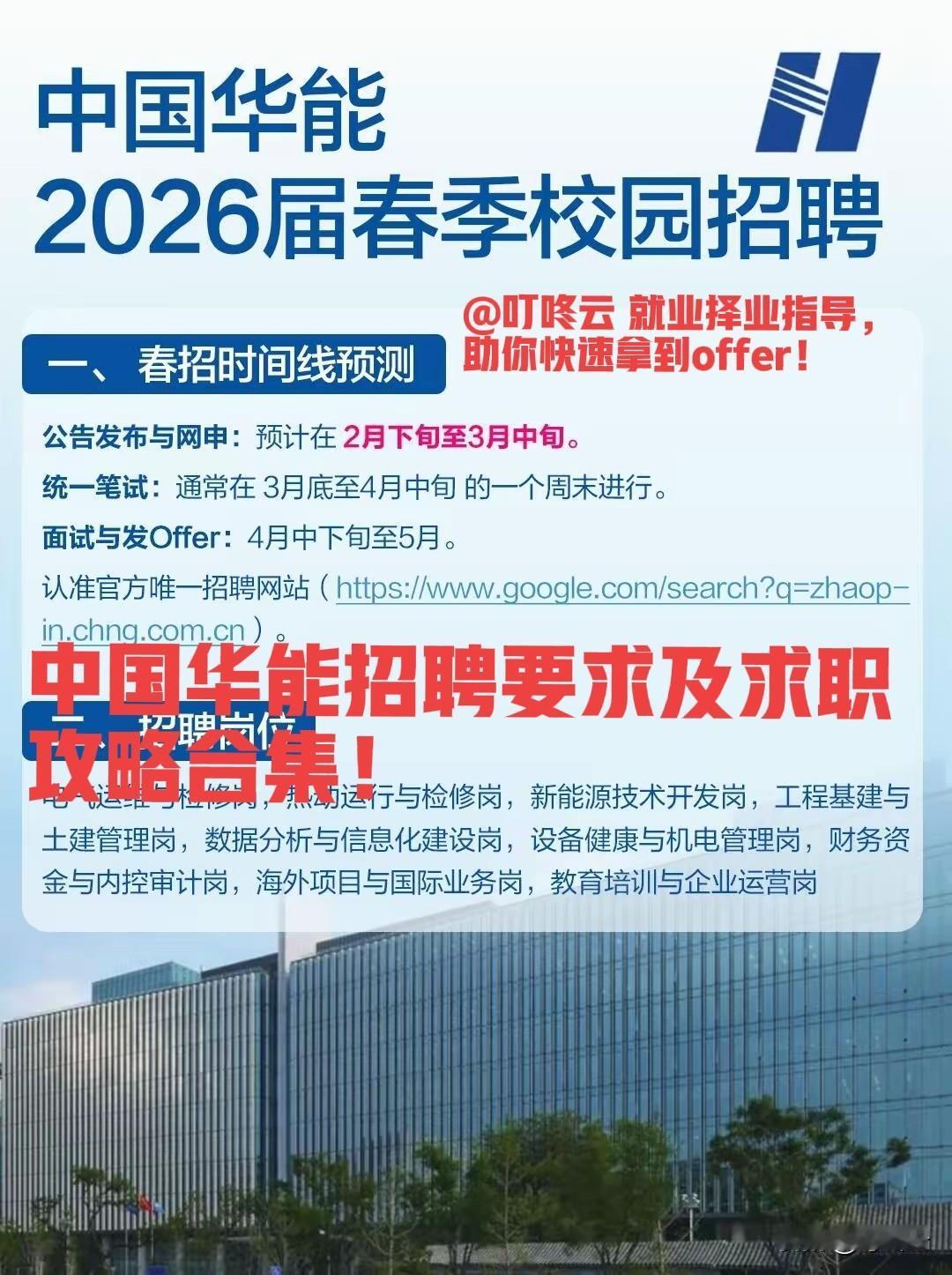 “王炸选手”快来报名!中国华能26年招聘要求及求职攻略干货合集!🔥中国华能2026春招:硬核央企的“offer直通车”!速速收藏起来备用![点亮平安灯][点亮平安灯][燃烧的心][燃烧的心] @叮咚云 帮你画重点:从2月下旬到3月中旬的网申窗口期,到3月底至4月中旬的统一笔试,再到4-5月的面试发榜,这波节奏必须精准踩中,别让机会从指缝溜走。[礼物][礼物] 1.专业上,电气、能源、土木、计算机、文科等多赛道全面开放,堪称“万物皆可华能”;英语门槛也清晰明了,本科CET-4、研究生CET-6,海外党也有雅思托福等效通道,别让语言成为你的“绊脚石”。[奥特曼][奥特曼] 2.薪酬福利更是“诚意拉满”:本科起薪7k-10k,研究生9k-13k,六险二金、倒班津贴、免费宿舍、年终奖一应俱全,妥妥的“央企顶配待遇”。[招财进宝][招财进宝] 3.网申要“卷细节”:班干部、党员身份要“显眼包”式突出,成绩单必须是盖了鲜章的高清PDF;笔试要“刷手感”,行测+专业知识+企业文化时政,缺一不可;面试主打“半结构化”,要把专业素养和岗位适配度狠狠拿捏。[加油][加油] 4.“会当凌绝顶,一览众山小”,华能的岗位遍布总部、火电厂、新能源基地,既有“城市精英”的高光,也有“基层攒钱”的踏实。别躺平,别emo,把简历打磨成“王炸”,把笔试练到“肌肉记忆”,下一个手握华能offer的,就是你![送自己一朵花][送自己一朵花] 欢迎关注@叮咚云 将优先为粉丝职业规划指导,为你定制最适合的就业择业方案!欢迎留言交流讨论。[来看我][来看我] 免责声明:图片来自网络,仅供参考