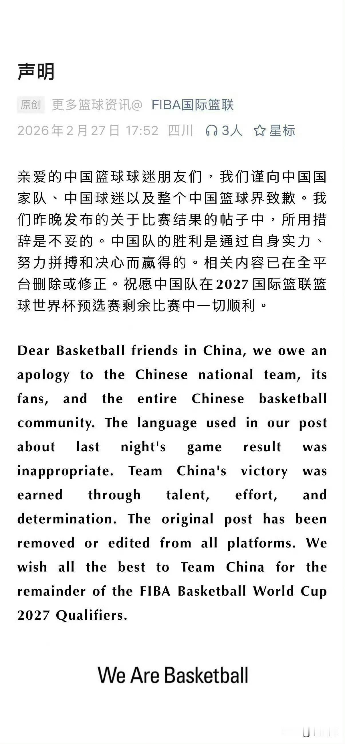 拒绝接受道歉!!! FIBA国际篮联发布声明:亲爱的中国篮球球迷朋友们,我们谨向中国国家队、中国球迷以及整个中国篮球界致歉。我们昨晚发布的关于比赛结果的帖子中,所用措辞是不妥的。 中国队的胜利是通过自身实力、努力拼搏和决心而赢得的。相关内容已在全平台删除或修正。祝愿中国队在2027国际篮联篮球世界杯预选赛剩余比赛中一切顺利。