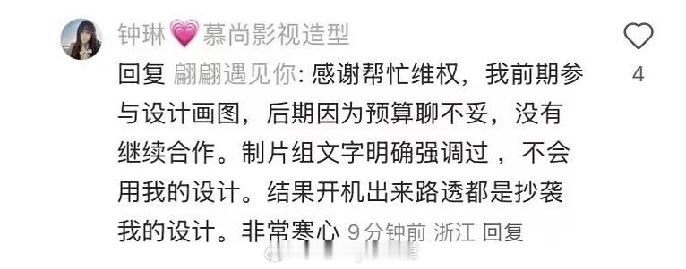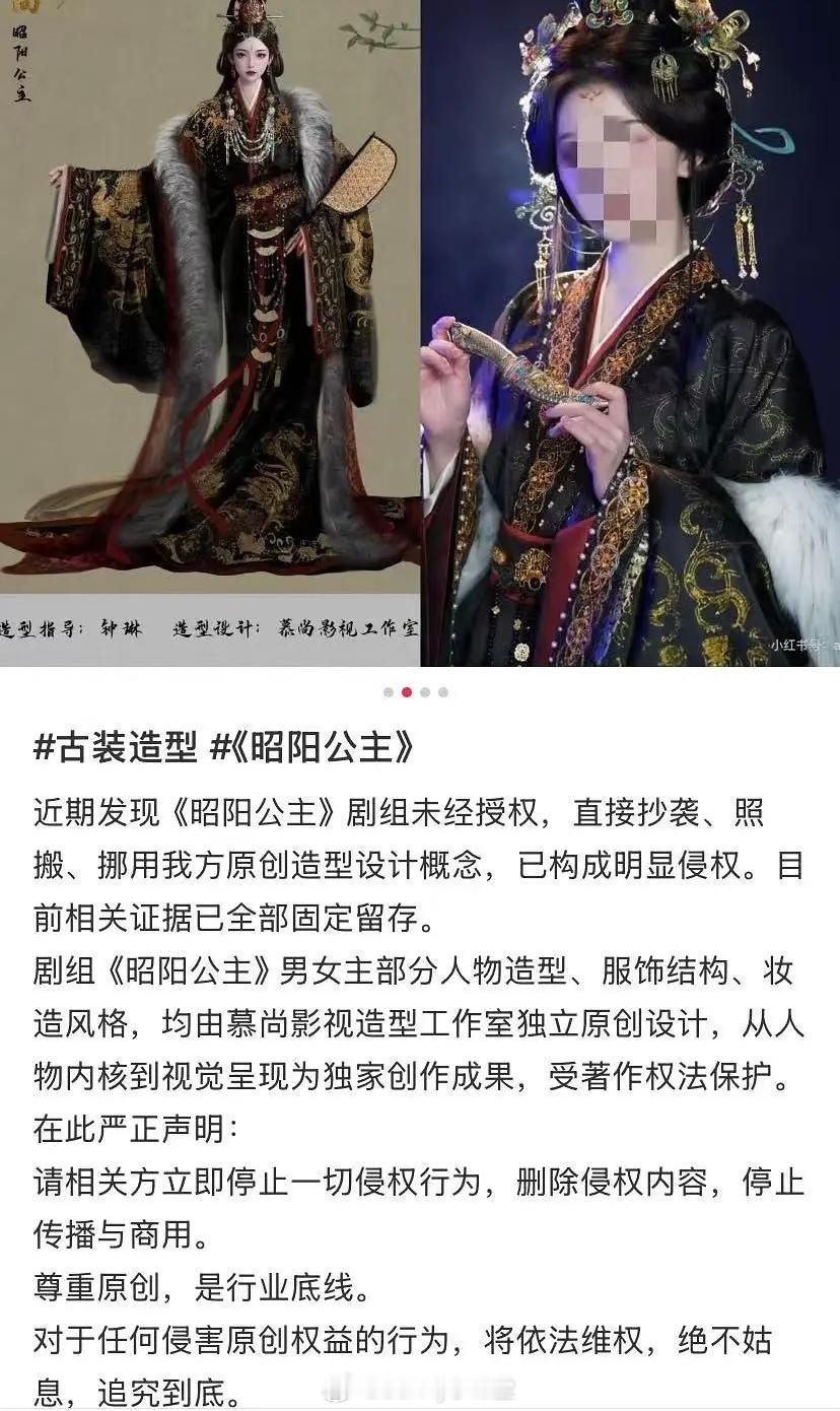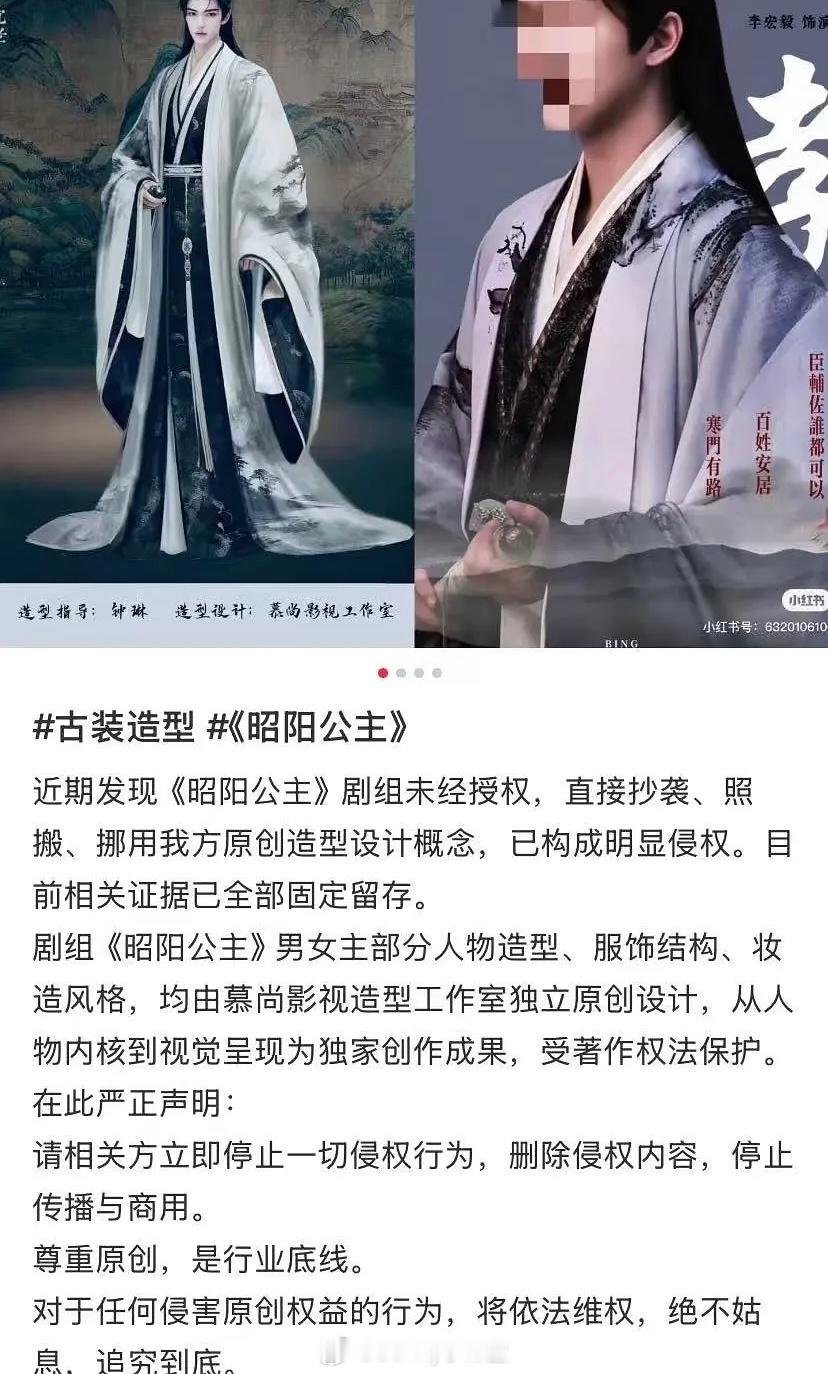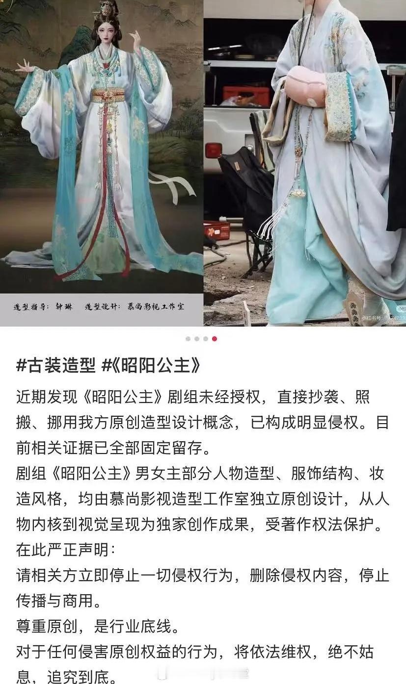 网友发文称李宏毅、孔雪儿主演的《昭阳公主》剧组未经授权,直接抄袭、照搬、挪用别人的原创设计概念!设计师称前期参与设计画图,后期因为预算聊不妥,没有继续合作。但制片组文字明确强调过不会用她的设计,结果开机出来路透都是抄袭她的!来看看像不像?