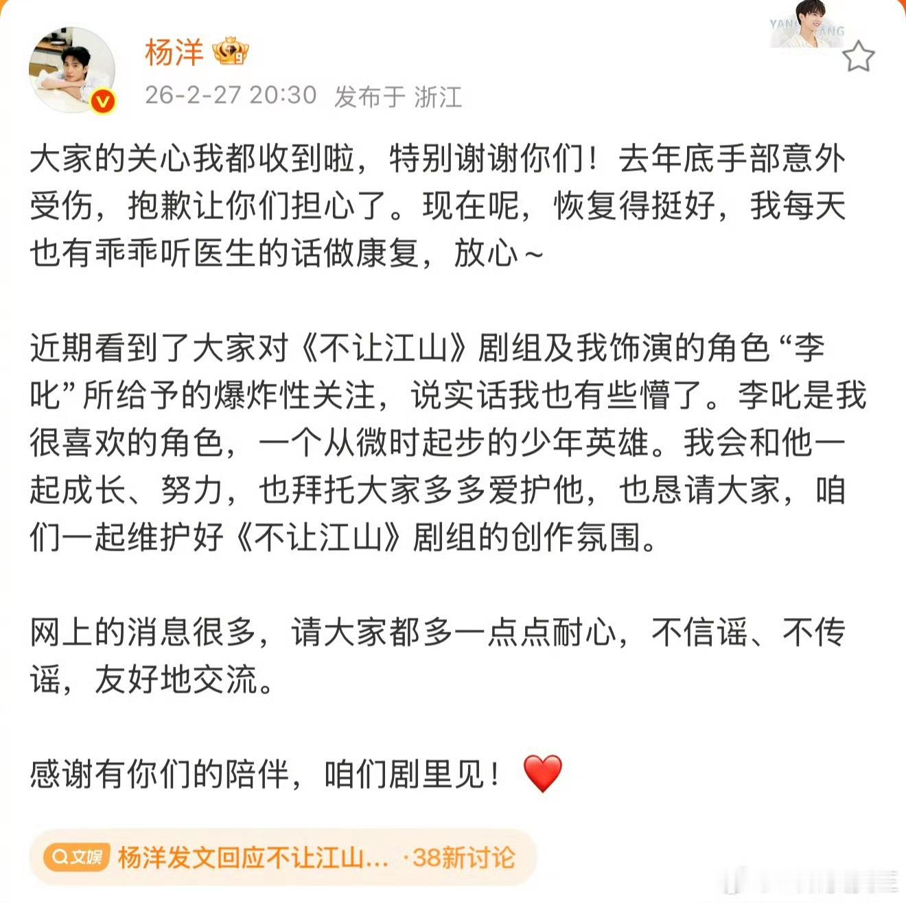 翻译一下,这个饼我很满意,角色我很喜欢,粉丝不要再闹了,已经影响剧组工作氛围了