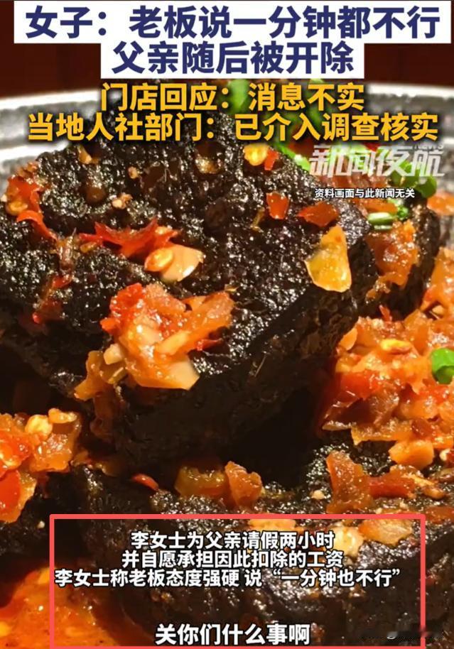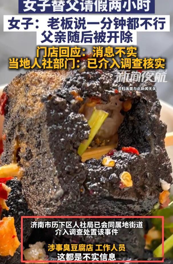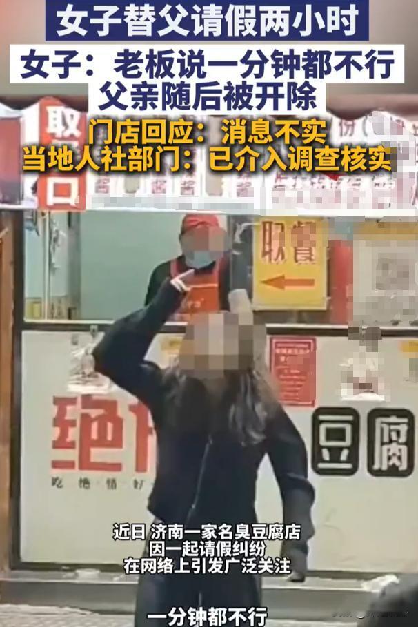 山东济南,李女士要回杭州上班,临走前想陪在臭豆腐店当炸锅师傅的父亲吃顿饭。父亲春节忙得脚不沾地,只休息一天。李女士为不耽误店里生意,打算11点后给父亲请2小时假,还表示工资照扣,吃完饭父亲可马上回店。可老板不仅不批假,还放话请假就开除。父亲是老员工,就因这被无情开除。李女士气不过找老板理论,店员说法不一,视频传网上大家为老人抱不平。目前当地有关部门介入,臭豆腐店正常营业,负责人称会发布情况说明。 27日,记者特意去了这家臭豆腐店。 店没关,还在正常营业,来往的人不算少,跟没事人一样。 记者找到负责人,对方一脸无奈,说这段时间总有人打电话骂他。 还反复强调,一周内会发布情况说明,解释清楚这件事。 可谁等得起这个说明,李女士已经买好了回杭州的票,就想临走前,跟父亲吃顿热乎饭。 她父亲在这家店做炸锅师傅好几年了,算是老员工,平时干活踏实,从不偷懒。 今年春节,别人都忙着团圆走亲访友,他连喘口气的时间都没有。 整个春节,他就休息了一天。 每天天不亮就到店里,守着那口滚烫的油锅,从早炸到晚,翻炸、控油、打包,手上全是油星子,忙得连喝口水的功夫都没有。 李女士看在眼里,疼在心里。 她知道父亲老实,不会主动请假,也怕给老板添麻烦。 所以她特意选了晚上11点后,街上人少了,店里也不忙了,才敢跟老板提请假的事。 她甚至主动说,就请2小时,工资照扣,绝不耽误店里生意,吃完饭父亲立马回店接着干活。 换谁看,这都够懂事了吧。 可老板的态度,冷得像冰。 一句一分钟都不行,直接撂下狠话,请假就开除。 老人一听就慌了,他上有老下有小,全靠这份工作养家,不敢丢。 可他也想陪女儿吃顿饭,这一分开,又得好几个月才能见面。 没等老人犹豫,老板就直接说,你要是非要请,现在就可以走了,不用再来了。 就因为这2小时的假,一个老员工,说被开除就被开除了。 李女士得知消息,立马赶到店里找老板理论。 她想问问老板,凭什么这么绝情,凭什么一个老员工的合理请求,都得不到一点体谅。 可店里的店员,说法乱得很。 有的说,老板那天心情不好,说话太急了。 有的说,店里确实忙,离不开人。还有的干脆说,不知道这件事,别问他。 李女士随手拍了视频,发到了网上。 没想到,视频一火,网友们的评论热闹了。 大家都在替老人抱不平,说老板太不近人情,连员工陪女儿吃顿饭的机会都不给。 也有人说,老员工兢兢业业干了这么久,就因为一次合理请假被开除,太寒心了。 还有人疑问,老板这么随便开除员工,合法吗?员工请假,老板就有权直接开除吗? 老板的这种做法,到底合不合法?老员工被无故开除,就只能认栽吗? 依据《劳动合同法》第39条明确规定,劳动者严重违反用人单位的规章制度的,用人单位可以解除劳动合同。 注意,是严重违反规章制度,才有权开除。 老人只是请求请假2小时,还主动提出工资照扣,既没有违反店里的规章制度,也没有给店里造成任何损失,根本达不到严重违反的程度。 《劳动合同法》第4条,用人单位制定的规章制度,必须经职工代表大会或者全体职工讨论,和工会或者职工代表协商确定,还要公示或者告知劳动者,才算合法有效。 就算这家臭豆腐店有“不准请假”的规定,要是没经过以上流程,没告知过老人,这个规定就是无效的,老板不能凭这个开除老人。 另外,春节期间,老人只休息一天,还得加班干活. 根据《劳动法》第44条,休息日安排劳动者工作,又不能安排补休的,要支付不低于工资200%的报酬;法定休假日安排工作的,支付不低于工资300%的报酬。 老人春节期间加班,老板要是没支付相应的加班费,本身就违反了劳动法。 现在还因为合理请假开除老人,更是错上加错。 老人作为老员工,被无故开除,完全可以向劳动仲裁部门申请仲裁,要求老板继续履行劳动合同,或者支付赔偿金。 赔偿金的标准,是每工作一年支付两个月工资,老人干了好几年,能拿到一笔不少的赔偿金,胜诉的概率很大。 老板以“请假”为由,随意开除老员工。 显然,老板的做法既不合情,也不合法。 老员工兢兢业业付出,春节放弃团圆坚守岗位,只是想陪女儿吃顿饭,这样的请求,本该被体谅,却换来被开除的结局,实在让人寒心。 目前当地有关部门已经介入,臭豆腐店还在正常营业,负责人承诺的情况说明,至今还没发布。 老板应该主动道歉,恢复老人的工作,支付相应的加班费和赔偿金,毕竟是自己理亏。 不知道大家怎么看?老板的做法真的合理吗?