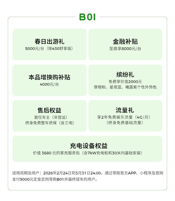买新能源车,参考销量真的很重要。 买新能源车,最靠谱的参考是什么?答案一定是车主口碑!在新势力品牌中,零跑汽车的口碑可以说是稳中向好,这也能从它的销量端看出端倪。要知道零跑已经达成了百万车主的里程碑,从50万到100万台仅用343天,百万零居的真实用车反馈,就是它最硬的底气,买它完全不用慌。 关键是,零跑在前两天,放出了开春购车礼遇活动,给百万销量的好口碑再加码,像是B系列的爆款车型B01,增换购享4000元现金补贴,金融贴息至高5000元,赠价值3680元家充服务包,首任非营运车主享整车+三电终身质保,个性外饰色限时免费,性价比直接拉满。 除了福利诱人,B01的产品力更是没的说。别看它是一款8.98万起的纯电轿车,有430km、550km、650km多续航版本可选,18分钟快充30%-80%,后置后驱布局6.4秒破百,操控流畅。双旗舰芯片+激光雷达智驾,2735mm轴距带来越级空间,家用、通勤全适配。 百万车主认证+开春钜惠+硬核产品力,2026买新能源车,零跑全系以及B01闭眼入不踩坑。刚需党别犹豫,趁3月权益窗口期上车,花10万级预算,享20万级体验。