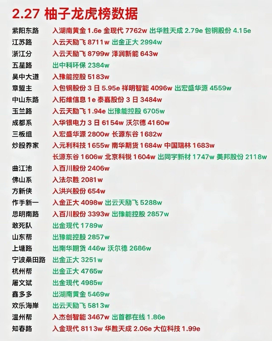 2.27龙虎榜炸场!2月27日,A股龙虎榜再度上演“神仙打架”,各路游资大佬火力全开,多只个股出现亿元级资金博弈。其中,章盟主单日豪掷近6亿元包钢股份,作手新一精准甩卖云天励飞,而湖南黄金、华胜天成等标的则成为资金抢筹焦点,多空分歧剧烈。一、章盟主当日操作堪称“大手笔”,以5.95亿元强势买入包钢股份,成为榜单上最亮眼的一笔交易。与此同时,他还小幅加仓祥明智能4096万元,同时减持宏盛华源4559万元。紫阳东路也同步大笔买入湖南黄金1.6亿元,同时卖出华胜天成2.79亿元、包钢股份4.15亿元,多空切换节奏凌厉。二、AI概念股云天励飞,成为当日游资博弈的核心标的。江苏路、浙江分公司、玉兰路三大席位合计买入超3.7亿元,其中玉兰路更是豪掷1.94亿元抢筹;而作手新一则精准“落袋为安”,卖出5288万元,欢乐海岸也同步减持5813万元。三、除了大盘股,多只中小盘股也出现游资活跃身影:- 中山东路:买入拓维信息1亿元,同时加仓泰嘉股份3484万元。- 成都系:布局华银电力6154万元、沃尔德4160万元。- 温州帮:买入杰创智能3467万元,同时清仓首都在线1.86亿元,切换节奏果断。- 炒股养家:分散布局元利科技、南华期货、中国瑞林等多只个股,同时减持同宇新材、美邦股份,呈现“多点开花”的策略。四、从龙虎榜数据来看,当前游资操作呈现两大特征:一是大资金集中押注周期股与AI算力,二是高位标的出现明显减持信号。对于普通散户而言,不要盲目跟风,一定要有自己的判断力。