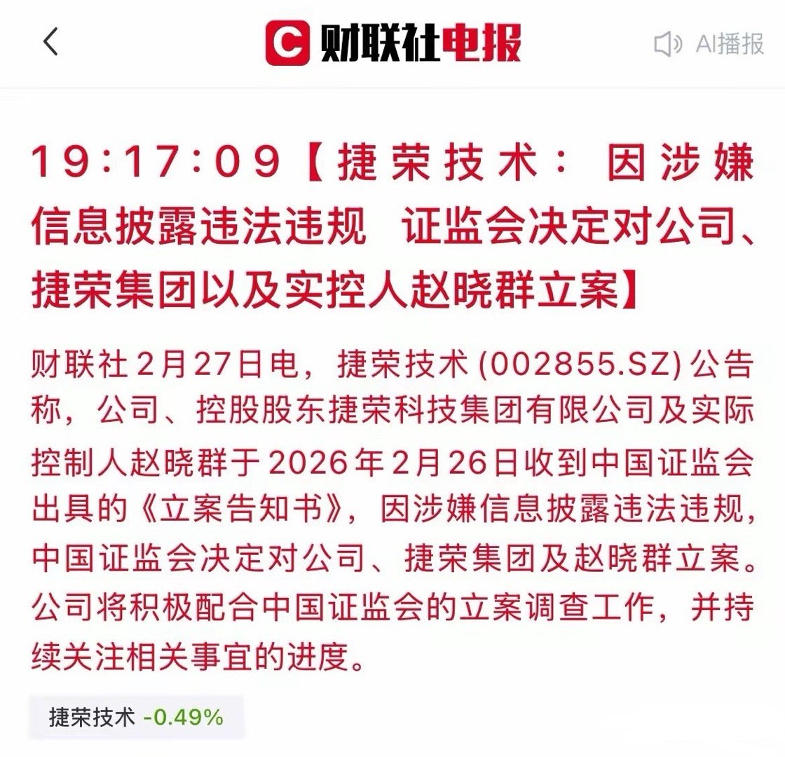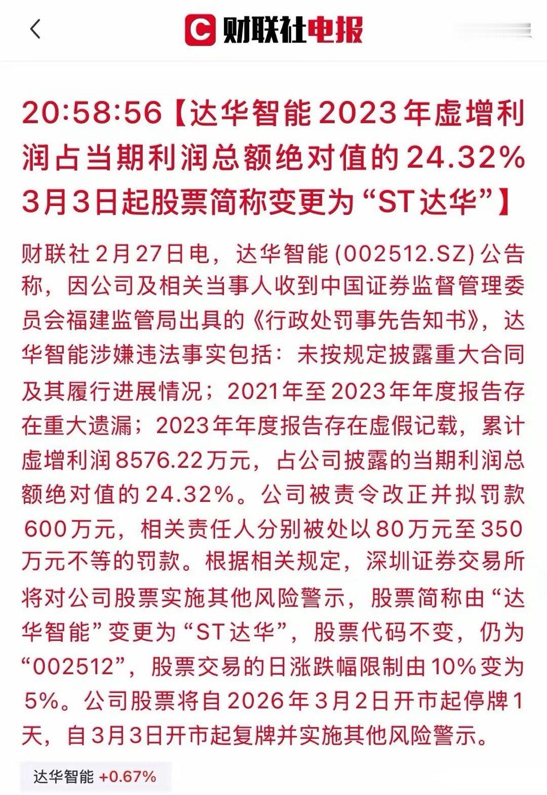 今夜“雷”声不断!接连4家A股公司集体爆雷,有的甚至一夜之间变ST!今晚,A股迎来密集“雷区”!双良节能、捷荣技术、海泰发展相继被证监会立案,更重磅的是,达华智能不仅要面临罚款,甚至直接被ST!散户直呼:防不胜防,干脆买ETF更安全!. 达华智能:今晚最重磅的“雷”,虚增利润超8500万,直接ST。公司也曾在2023年年度报告中存在虚假记载!所以股民朋友一定得擦亮眼,有黑历史的要慎重,接下来等待它的很可能是跌停!·双良节能、海泰发展:都因“误导性陈述”被证监会立案,虽然公司强调经营正常,但在A股市场,一旦贴上“立案调查”的标签,短期股价往往面临巨大抛压。·捷荣技术:这次涉及面极广,不仅公司本身被查,连控股股东捷荣集团及实际控制人赵晓群也一同被立案。这种“一锅端”式的调查,往往意味着内部治理可能存在严重问题,对投资者信心的打击几乎是毁灭性的。这背后是监管层对资本市场信息造假“零容忍”的持续高压态势。尤其是新《证券法》实施后,对于信披违规的打击力度空前。此次达华智能被重罚并ST,就是一个强烈的监管信号:只要敢在财报上动手脚,不仅重罚,还要“戴帽”!现在的A股,业绩差、问题股的风险正在加速暴露。谨慎选择,守住本金比什么都重要。