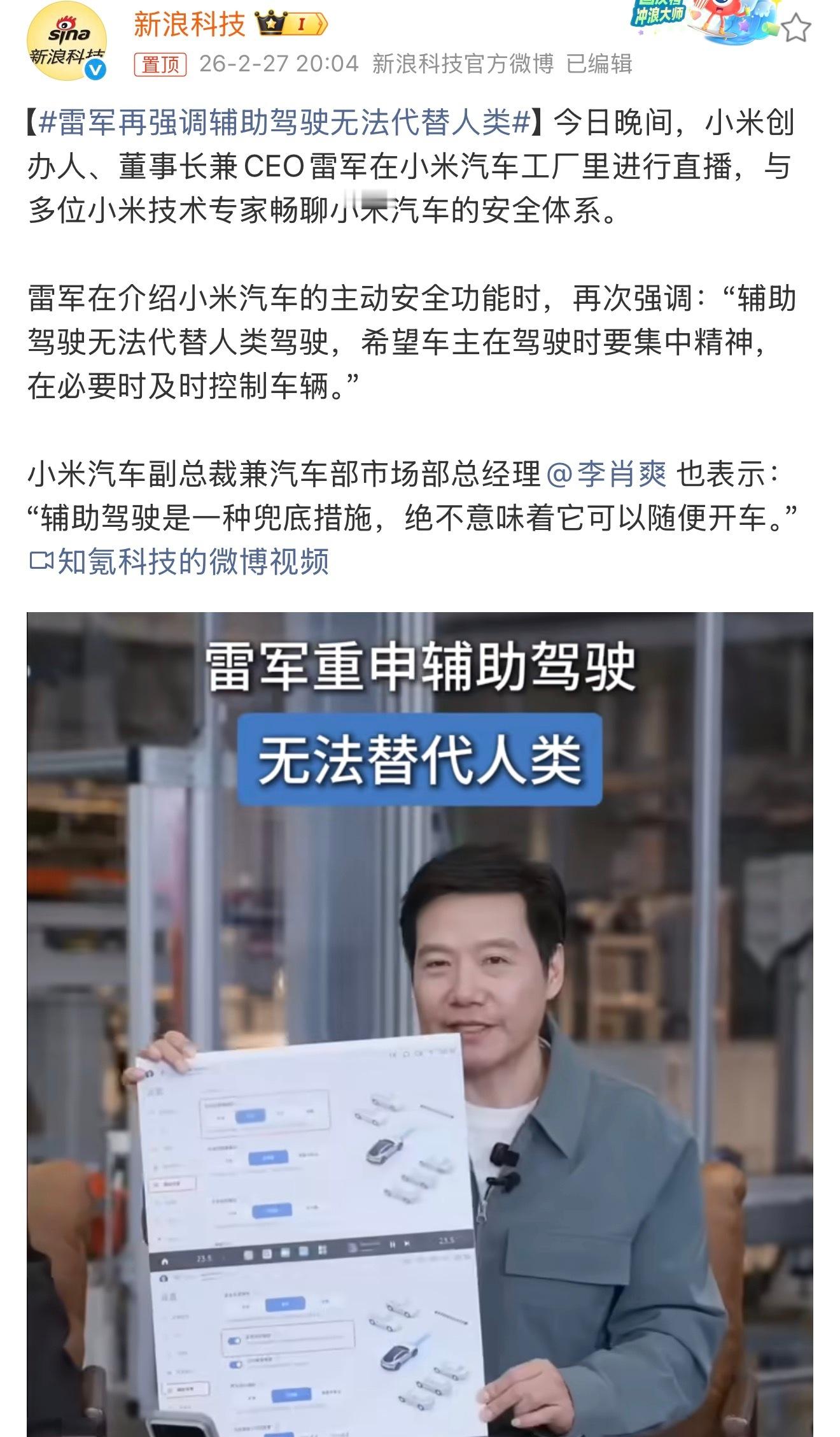雷军再强调辅助驾驶无法代替人类事实就是这样,虽然现在的辅助驾驶越来越牛,能自动跟车、变道,甚至在某些路段让你放开手脚。