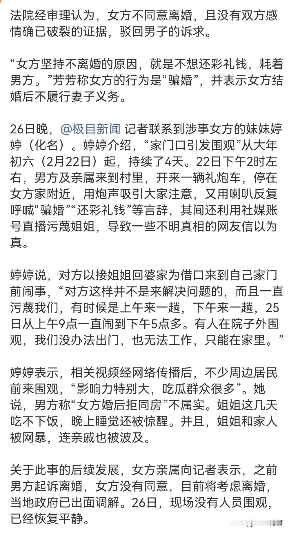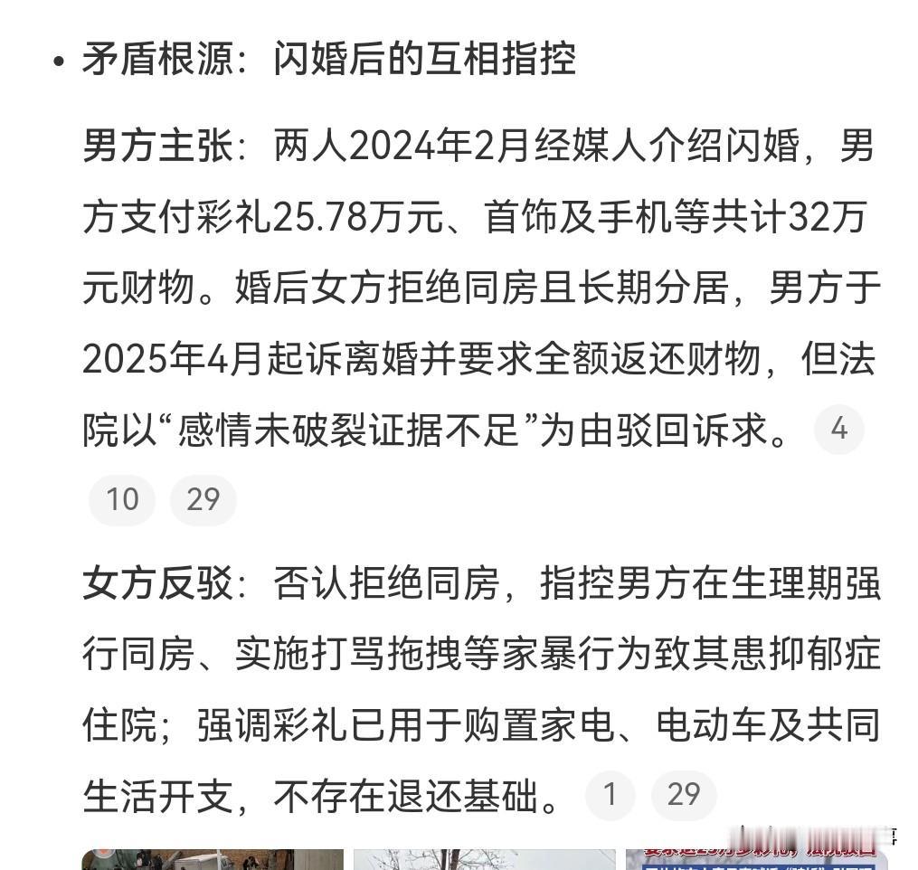 现在这年头是结婚容易离婚难。 有的明明感情破裂了还不让离婚。 2月27日热搜,有一对相亲认识的男女,男方花了20多万的彩礼,加上其他的共30多万。 没想到两人闹矛盾了,男方说女方拒绝同房,女人则提出了反驳,所以男的家暴,说那些彩礼钱都用光了。 也不知道他们谁在撒谎。 男方从初六起用喇叭宣传说女的骗婚,女方说女子被弄的饭都吃不下,颜面扫地。 不管他们谁撒谎,这说明一个问题,那就是相亲付高额的彩礼,意味着巨大的风险。 高彩礼本来就是一个畸形产物。