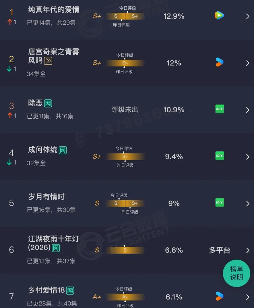 2.26 云合纯真年代的爱情,一位了。江湖夜雨十年灯,这就开始往下掉了。扑得太狠了。玫瑰丛生:2.7%首日