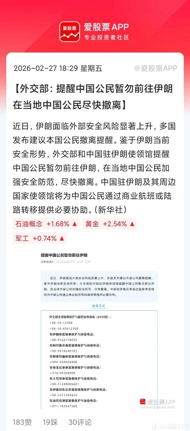 外交部提醒中国公民暂勿前往伊朗。老美这是真的要打了?愿世界和平!